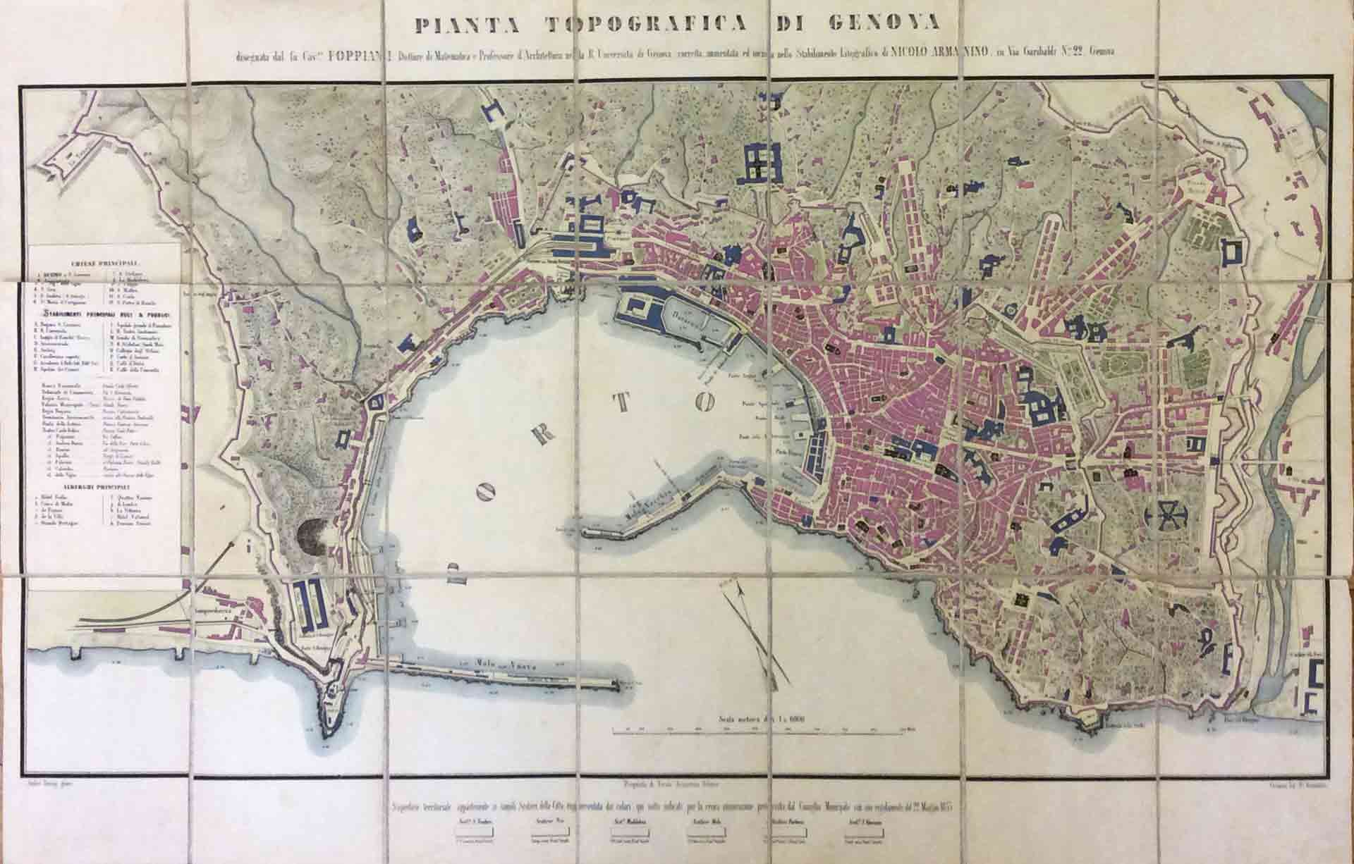 Bella pianta della città di Genova (cm. 51,5x78) litografata a colori, montata su tela e suddivisa in 28 riquadri. La pianta, in scala 1: 6000, è stata incisa da André Hoenig e disegnata dal fu Cav.re Foppiani, Dottore di Matematica e Professore d'Architettura nella R. Università di Genova, corretta, aumentata ed incisa nello stabilimento Litografico di Nicolò Armanino; sul lato sinistro porta l'elenco delle chiese, degli stabilimenti regi e pubblici e degli alberghi. Al margine inferiore, la scritta: Superficie territoriale appartenente ai singoli Sestieri della Città (S. Teodoro, Pre', Maddalena, Molo, Portoria, S. Vincenzo), rappresentata dai colori, qui sotto indicati, per la civica numerazione...Ben conservata, con custodia in cartonato coevo (mm. 182x122).
