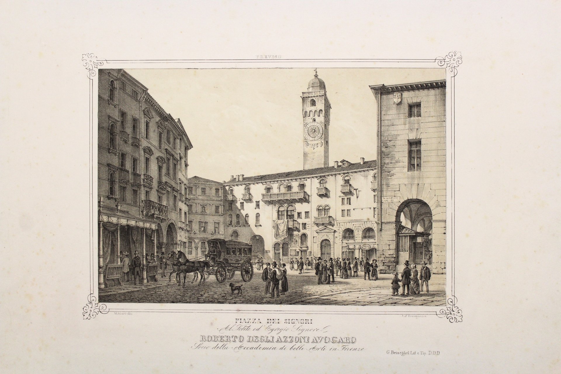 Litografia, mm 196x290 (immagine). Splendida veduta della principale piazza di Treviso con elegante scena animata in primo piano. Ottimo esemplare con ampi margini