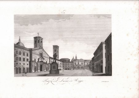 Veduta pubblicata nel noto ' Atlante illustrativo, ossia Raccolta dei principali monumenti italiani antichi, del Medio evo e moderni, e di alcune vedute pittoriche… ' di Attilio Zuccagni-Orlandini, edito in 3 tomi nel 1845 a Firenze, per servire di corredo alla ' Corografia fisica, storica e statistica dell'Italia…, opera in 12 volumi, pubblicati dal 1837 al 1845, corredata - oltre che dall'Atlante illustrativo ' sopra descritto - anche da un ' Atlante geografico degli Stati italiani, ' in due tomi. Attilio Zuccagni Orlandini (1784-1872) nacque a Fiesole con il nome di Giuseppe Orlandini. In seguito all’adozione da parte del facoltoso zio materno Attilio Zuccagni (1754-1807), botanico e georgofilo, assunse il nome di Attilio Zuccagni Orlandini. La sua più importante opera è la relazione geografico-cartografica di tutti gli Stati preunitari italiani, la grandiosa ' Corografia fisica, storica e statistica dell’Italia e delle sue Isole ' (Firenze 1835-1845), in dodici volumi per diciannove tomi, con un volume introduttivo sull’intera penisola italiana. L’opera costituì la summa delle centinaia di opere geografiche generali, regionali e locali allora disponibili e presentava, per ogni Stato preunitario, la trattazione fisica, storica, topografica e un inquadramento statistico. Nel 1844-45, la ' Corografia ' fu arricchita con cinque volumi di cartografie, vedute e altre illustrazioni di luoghi e monumenti: ' Atlante geografico degli Stati italiani delineato sopra le migliori e più moderne mappe ' (due volumi con 144 tavole inclusa la grande carta della penisola in 15 fogli) e ' Atlante illustrativo ossia raccolta dei principali monumenti italiani antichi, del medio evo e moderni e di alcune vedute pittoriche ' (tre volumi con 413 illustrazioni, stampate su 269 fogli). Le tavole furono incise, sempre a Firenze, in due apposite officine, da quattro valenti artisti lombardi (Vittorio Angeli, Giacinto Maina, Pietro Manzoni e Giuseppe Pozzi). Soprattutto il primo dei due atlanti rappresenta, ancora oggi, una pietra miliare nella storia della cartografia e dell’iconografia geografica italiana. Fu veramente ‘un’ardua impresa’, dal momento che spesso mancavano ancora (come, ad esempio, per il ' Ducato di Lucca ' e lo ' Stato Pontificio) prodotti cartografici compiutamente geometrici. I due prodotti furono presentati ai Georgofili nel 1843 e nel 1844, insieme alla mappa della Repubblica di San Marino. L’opera si rivelò oltremodo costosa e non ottenne il successo commerciale sperato, ma servì da base per tante altre iniziative editoriali successive che vi attinsero, talora senza neppure rispettarne i diritti d’autore. ' Incisione su rame all'acquaforte, in ottimo stato di conservazione. ' Bibliografia: Anna Guarducci - ' Dizionario Biografico degli Italiani ' - Volume 100 (2020). View published in the famous ' Atlante illustrativo, ossia Raccolta dei principali monumenti italiani antichi, del Medio evo e moderni, e di alcune vedute pittoriche. di Attilio Zuccagni-Orlandini, published in 3 volumes in Florence, 1845, to accompany the ' Corografia fisica, storica e statistica dell'Italia., a work in 12 volumes, published from 1837 to 1845, accompanied - in addition to the Atlante illustrativo described above - also by a ' Atlante geografico degli Stati italiani, in two volumes. Attilio Zuccagni Orlandini (1784-1872) was born in Fiesole under the name of Giuseppe Orlandini. Following adoption by his wealthy maternal uncle Attilio Zuccagni (1754-1807), a botanist and georgofile, he took the name Attilio Zuccagni Orlandini. His most important work is the geographic-cartographic report of all the pre-unification Italian states, the great ' Corografia fisica, storica e statistica dell'Italia e delle sue Isole ' (Florence 1835-1845), in twelve volumes for nineteen tomes, with an introductory volume on the entire Italian peninsula. The work constituted the sum of hundreds of general, regional and local geographic works then available and presented, for each pre-unification state, the physical, historical, topographical and statistical framework. In 1844-45, the ' Corografia ' was enriched with five volumes of maps, views and other illustrations of places and monuments: ' Atlante geografico degli Stati italiani delineato sopra le migliori e più moderne mappe ' (two volumes with 144 plates including the large map of the peninsula in 15 sheets) and ' Atlante illustrativo ossia raccolta dei principali monumenti italiani antichi, del medio evo e moderni e di alcune vedute pittoriche ' (three volumes with 413 illustrations, printed on 269 sheets). The plates were engraved, again in Florence, in two special workshops, by four talented Lombard artists (Vittorio Angeli, Giacinto Maina, Pietro Manzoni and Giuseppe Pozzi). Especially the first of the two atlases represents, even today, a milestone in the history of cartography and Italian geographic iconography. It was truly 'an arduous undertaking', since cartographic products were often still lacking (as, for example, for the Duchy of Lucca and the Papal States) fully geometric. The two products were presented to the Georgofili in 1843 and 1844, along with the map of the Republic of San Marino. The work proved to be very expensive and did not achieve the commercial success hoped for, but served as a basis for many other subsequent publishing initiatives that drew on it, sometimes without even respecting the copyright. ' Etching, in excellent condition. ' Literature: Anna Guarducci - ' Dizionario Biografico degli Italiani ' - Volume 100 (2020). Cfr.
