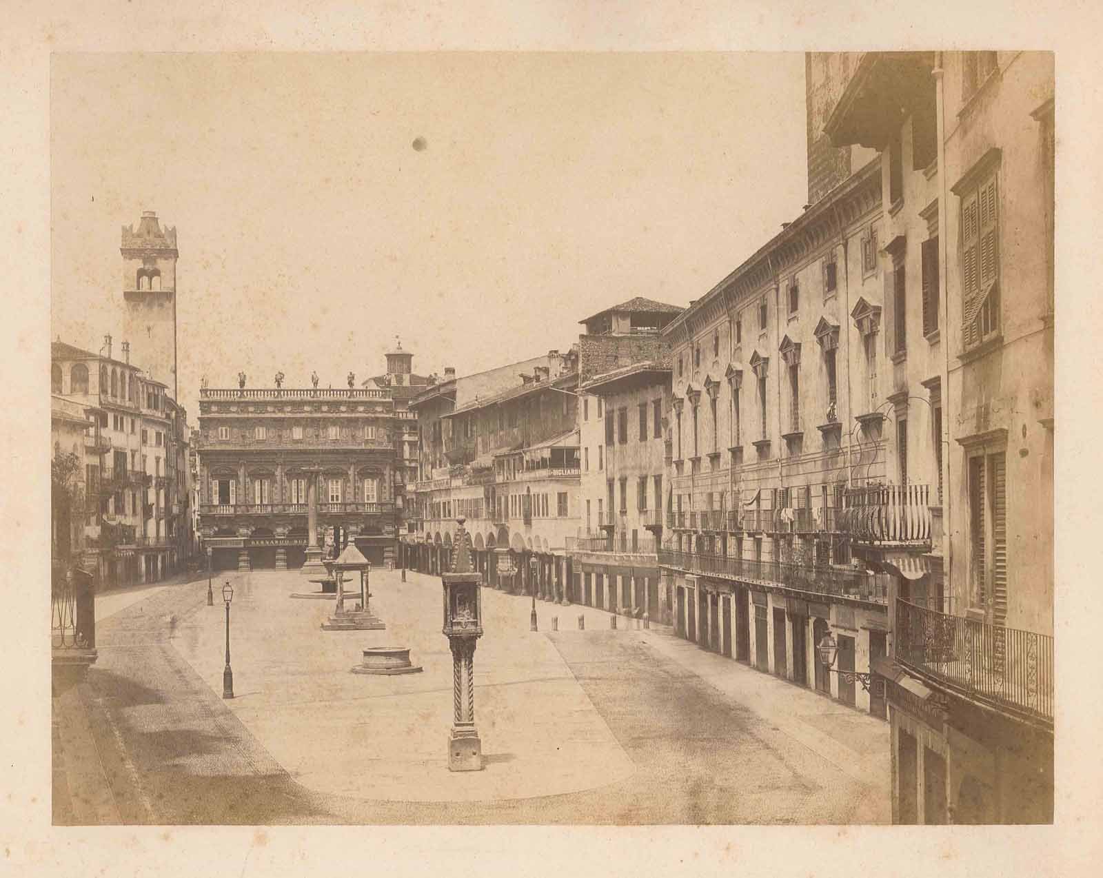 Veduta della Piazza delle Erbe a Verona. L'imagine è di notevole interesse per la storia della città ed in particolare per la disposizione dei monumenti ivi collocati. Partendo dal fondo della Piazza possiamo notare una colonna di marmo bianco sulla cui sommità, quest'oggi e prima dell'occupazione francese della città, si trova e trovava un leone di San Marco; successivamente incontriamo la fontana, il monumento più antico della Piazza, denominata Madonna di Verona; dopo questa troviamo la tribuna o capitello, detta berlina, mentre verso via Cappello sorge un'antica colonna sormontata da un'edicola nelle cui nicchie sono scolpite a rilievo le figure della Vergine e dei santi Zeno, Pietro e Cristoforo. Perfetto stato di conservazione