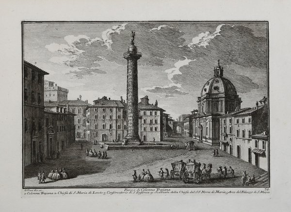Veduta tratta dalla monumentale opera ' Delle magnificenze di Roma antica e moderna.Pubblicata in 10 volumi dal 1747 al 1761, l’opera presenta 238 incisioni in rame, ciascuna incisione con testo narrativo che fornisce informazioni storiche e documentarie. ' Conosciuto dai più semplicemente come il "maestro" di Giovanni Battista Piranesi, Giuseppe Vasi rivela in quest'opera monumentale la pienezza della sua creatività grafica. I 10 libri che la compongono hanno ognuno un frontespizio con titolo e data diversi: ' Libro primo che contiene le porte e mura; Libro secondo, che contiene le piazze principali di Roma con obelischi, colonne, ed altri ornamenti; Libro terzo, che contiene le basiliche e chiese antiche di Roma; Libro quarto che contiene i palazzi e le vie più celebri; Libro quinto che contiene i ponti e gli edifizj sul Libro sesto che contiene la chiese parrocchiali; Libro settimo che contiene i conventi e case dei chierici regolari; Libro ottavo che contiene i monasteri e conservatorj di donne; Libro nono che contiene i collegj, spedali, e luoghi pii; decimo che contiene le ville e giardini più rimarchevoli. Le ' Magnificenze ' forniscono un panorama completo e al tempo stesso anticonvenzionale dell'Urbe: così, insieme alle consuete, celeberrime inquadrature desunte dalla migliore tradizione vedutistica, si trova anche una Roma insolita, quella che, talvolta, non esiste più. A quest'opera, di centrale importanza nell'editoria romana di metà Settecento, l'Autore aveva lavorato per quasi un ventennio realizzando una monumentale guida dell'Urbe dove accanto alle consuete e celeberrime inquadrature tratte dalla migliore tradizione vedutistica, immortala anche scorci insoliti che sono poi scomparsi con il cambiare della città. Il testo che accompagna le vedute nel primo volume è opera di Giuseppe Bianchini, nel secondo di Orazio Orlandi e nei restanti del Vasi stesso. A partire dall'edizione del 1786, l'opera del Vasi, fu aggiornata dal figlio Mariano, che la pubblicò col titolo ' Raccolta delle più belle vedute antiche, e moderne di Roma, mostrando solo il nome del padre come autore. Questa nuova edizione presentava molte tavole della prima edizione, ed alcune nuove. Anche la pubblicazione di Mariano Vasi fu stampata più volte, sempre con l’aggiunta di nuove tavole. Esemplare tratto dalla seconda edizione dell'opera, edita nella seconda metà del '700. Acquaforte, stampata su carta vergata coeva, completa dei margini, in ottimo stato di conservazione. ' View taken from the monumental work ' Delle magnificenze di Roma antica e moderna. Published in 10 volumes from 1747 to 1761, the work features 238 copper engravings, each engraving with a narrative text that provides historical and documentary information. Known by most simply as the "master" of Giovanni Battista Piranesi, Giuseppe Vasi reveals in this monumental work the fullness of his graphic creativity. The 10 books that compose it each have a title page with a different title and date: ' Libro primo che contiene le porte e mura; Libro secondo, che contiene le piazze principali di Roma con obelischi, colonne, ed altri ornamenti; Libro terzo, che contiene le basiliche e chiese antiche di Roma; Libro quarto che contiene i palazzi e le vie più celebri; Libro quinto che contiene i ponti e gli edifizj sul Libro sesto che contiene la chiese parrocchiali; Libro settimo che contiene i conventi e case dei chierici regolari; Libro ottavo che contiene i monasteri e conservatorj di donne; Libro nono che contiene i collegj, spedali, e luoghi pii; decimo che contiene le ville e giardini più rimarchevoli. The ' Magnificences ' provide a complete and at the same time unconventional panorama of the City: thus, together with the usual, celebrated shots taken from the best tradition of ' vedutistica, one also finds an unusual Rome, one that, at times, no longer exists. The author had worked on this work, of central importance in Roman publishing in the middle of the eighteenth century, for almost twenty years, producing a monumental guide to the “Urbe” where, alongside the usual and famous shots taken from the best tradition of ' vedutistica, he also immortalized unusual views that have since disappeared with the change of the city. The text that accompanies the views in the first volume is by Giuseppe Bianchini, in the second by Orazio Orlandi and in the remaining ones by Vasi himself. Starting from the edition of 1786, the work of Vasi, was updated by his son Mariano, who published it under the title ' Raccolta delle più belle vedute antiche, e moderne di Roma, showing only the name of his father as author. This new edition presented many plates of the first edition, and some new ones. The publication of Mariano Vasi was also printed several times, always with the addition of new plates. ' ' From the ' second ' edition of Vasi's ' Delle Magnificenze di Roma Antica e Moderna. Etching, printed on contemporary laid paper, in very good condition. Cfr. Scalabroni 111
