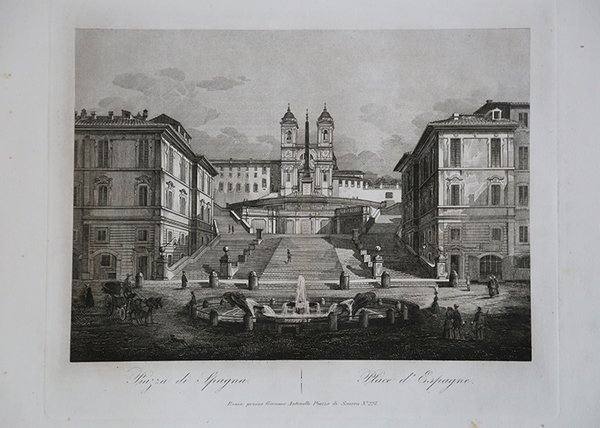 Veduta tratta dall’opera ' Nuova Raccolta delle principali vedute antiche e moderne dell’Alma città di Roma e sue vicinanze, incise a bulino da Pietro ed Achille Parboni e Pietro Ruga l’anno 1830, ' edita da Giacomo Antonelli con imprint ' Roma presso Giacom.o Antonelli in Via del Corso alle Convertite num 179B. Le tavole dell’opera furono incise tra il 1825 e il 1829 da diversi incisori tra i quali i fratelli Parboni e Pietro Ruga. Ciascuna reca il nome dell’incisore, l’indirizzo editoriale e una doppia didascalia in italiano e in francese. Acquaforte, in ottimo stato di conservazione. View taken from the work ' Nuova Raccolta delle principali vedute antiche e moderne dell'Alma città di Roma e sue vicinanze, engraved with engraving by Pietro and Achille Parboni and Pietro Ruga the year 1830, published by Giacomo Antonelli with imprint ' Roma presso Giacom.o Antonelli in Via del Corso alle Convertite num 179B. The plates were engraved between 1825 and 1829 by several engravers including the Parboni brothers and Pietro Ruga. Each bears the engraver's name, editorial address, and a double caption in Italian and French. Etching, in very good condition. Cfr.