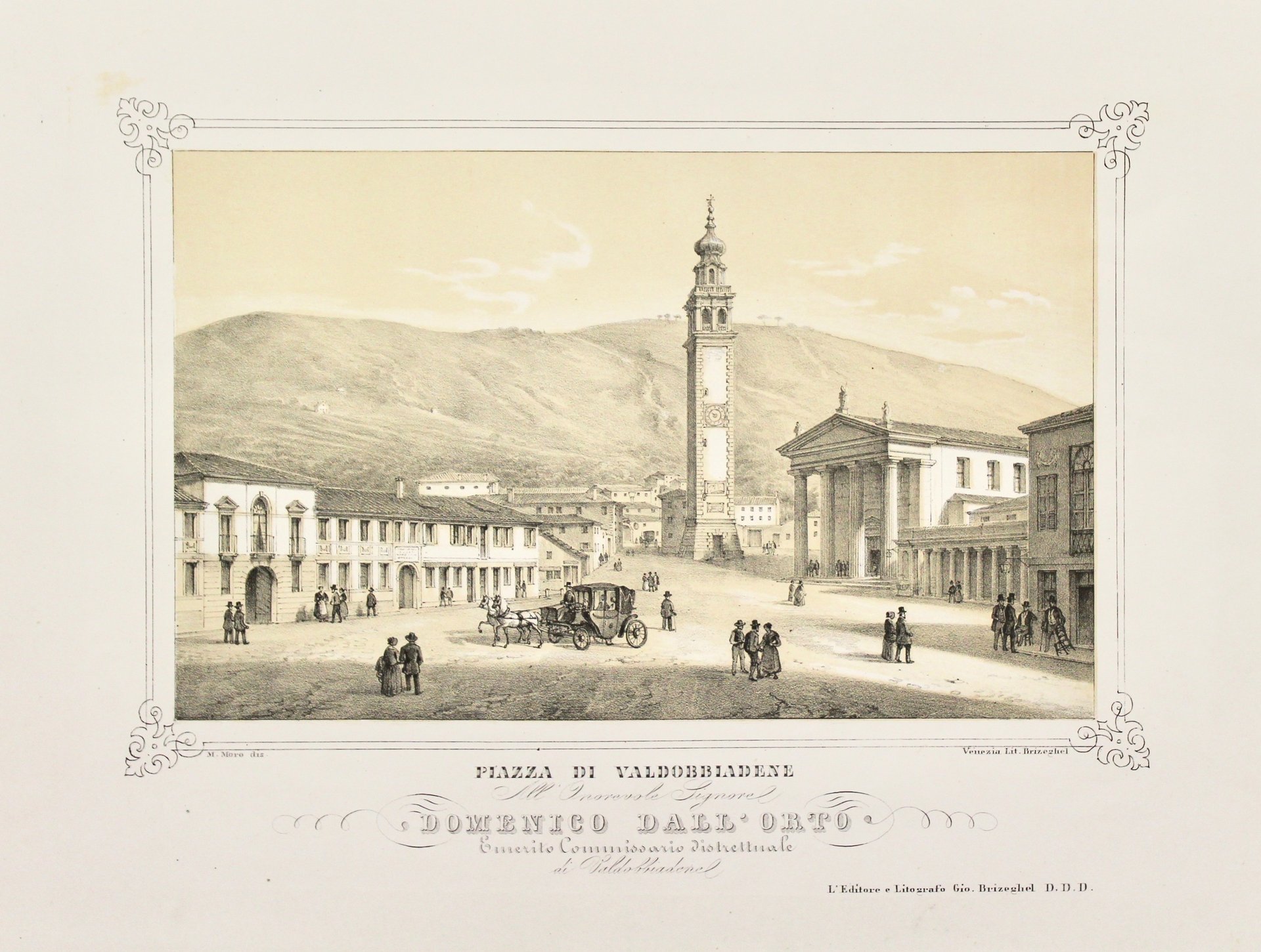 Litografia, mm 180x290 (immagine), eseguita su disegno di Moro dall'editore litografo Brizeghel. Tratta dall'opera "Treviso e la sua provincia" composta da 24 tavole rappresentanti gli scorci più caratteristici e rappresentativi della città e dintorni. Bellissimo esemplare molto marginoso. <BR>Litograph, mm 174x280 (immagine), on subject by Moro printed by Brizeghel. From "Treviso e la sua provincia" 24 plates illustrating the most significant views of Treviso and surroundings. Very good condition. <BR>