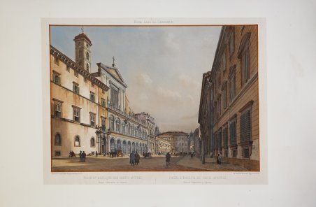 Veduta tratta dalla monumentale opera di Felix Benoist ' Rome dans sa grandeur. Vues, monument ancient et modernes ' stampata a Parigi in 3 volumi, da Henri Charpentier, nel 1870. La pubblicazione, illustrata da 100 litografie, fu preceduta da una campagna di disegni preparatori, a far data dal 1864 sino al 1869, eseguita soprattutto da Félix Benoist e in parte da Philippe Benoist. Alla vigilia del Concilio Ecumenico Vaticano I, l’11 agosto 1869, Pio IX decretava la realizzazione di una ' Esposizione romana delle opere d’ogni arte eseguite per il culto cattolico, che venne inaugurata, il 17 febbraio 1870, nel chiostro della Certosa di Santa Maria degli Angeli. In quell’occasione, vennero presentati i tre volumi in folio ' Rome dans sa grandeur. I volumi, rilegati in modo sfarzoso, con impresso al centro in oro, lo stemma di Pio IX, sono suddivisi in tre sezioni. Il primo volume tratta di ' Roma antica, il secondo, di ' Roma cristiana, ed il terzo, dei monumenti e le realizzazioni della ' Roma moderna. Una visione preziosa della Roma papale alla vigilia della profonda trasformazione di Roma in capitale dell’Italia unita. Un documento che evidenzia la notevole impronta lasciata da Pio IX nella Città Eterna. L’opera rappresenta il capolavoro dell’artista francese, dove ogni veduta è realizzata in litografia tinta, processo ottenuto usando un diverso numero di pietre. Il risultato è un’opera di grande effetto, tanto da porre il Benoist tra la schiera dei più grandi artisti di interni e vedute del suo tempo. Litografia tinta, finemente colorata a mano, in ottimo stato di conservazione. View taken from the monumental work of Felix Benoist ' Rome dans sa grandeur. Vues, monument ancient et modernes ' printed in Paris in 3 volumes, by Henri Charpentier, in 1870. The publication, illustrated by 100 lithographs, was preceded by a campaign of preparatory drawings, from 1864 to 1869, executed mainly by Felix Benoist and partly by Philippe Benoist. On the eve of the First Vatican Ecumenical Council, August 11, 1869, Pius IX decreed the creation of the ' Esposizione romana delle opere d’ogni arte eseguite per il culto cattolico ' (a Roman Exhibition of the works of art created for Catholic worship), which was inaugurated on February 17, 1870, in the cloister of the Charterhouse of Santa Maria degli Angeli. On that occasion, the three volumes in folio ' Rome dans sa grandeur ' were presented. The volumes, magnificently bound, with the coat of arms of Pius IX stamped in gold in the center, are divided into three sections. The first volume deals with ancient Rome, the second with “Christian” Rome, and the third with the monuments and achievements of modern Rome. A precious vision of papal Rome on the eve of the profound transformation of Rome into the capital of united Italy. A document that highlights the remarkable imprint left by Pius IX in the Eternal City. The work represents the masterpiece of the French artist, where each view is made in tinted lithography, a process achieved by using a different number of stones. The result is a work of great effect, so much so as to place Benoist among the ranks of the greatest artists of interiors and views of his time. Tinted lithograph, finely hand-colored, in excellent condition. Cfr.