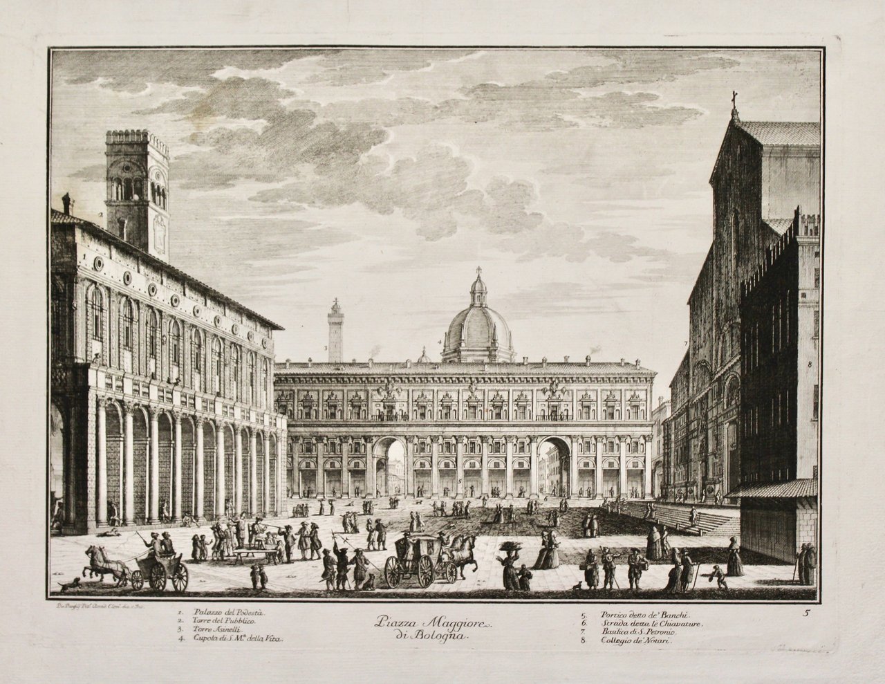Incisione in rame all'acquaforte, mm 340x470, firmata in basso a sinistra dall'artista "Pio Panfilj Pitt.e Accad. Clem.dis. e Inc.". Splendida veduta della piazza con san Petronio a destra e il palazzo del Podestà a sinistra. Otto rimandi in basso . Una delle più importanti vedute della più rinomata serie di stampe bolognesi. Brighetti, 116/5