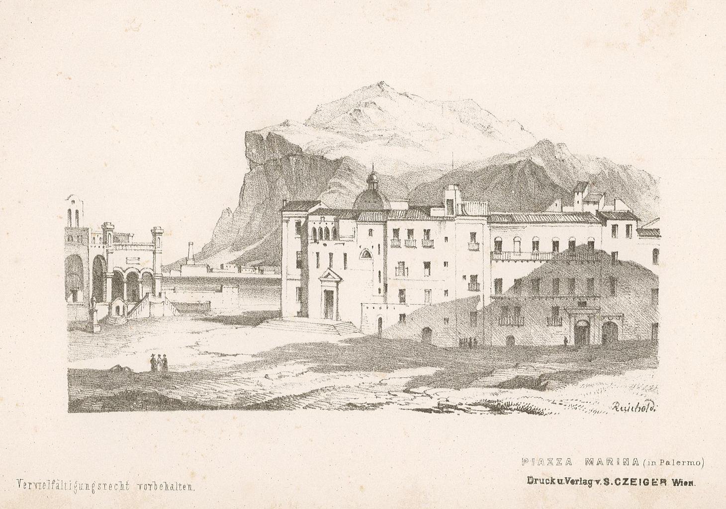 Stampa, antica ed originale, raffigurante Piazza Marina. Autore: Reinhold F. dis. & Czeiger S. edit. Luogo: Palermo. Anno: 1870 ca. Tecnica: litografia. Dimensioni: 175x265 (il foglio). Inserita nell'opera "Landschaften von Professor F. Reinhold", Druck una Verlag von S. Czeiger in Wien