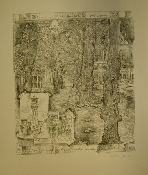 Litografia originale in formato cm.70,5x50, raffigurante uno scorcio di Piazza Napoleone a Lucca "in una mattinata di pioggia", con piccoli scorci di Piazza San Martino e della Torre Guinigi. Tiratura limitata di 20 esemplari, n°V. Codice libreria 111829.