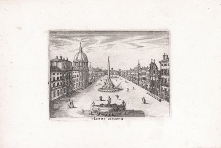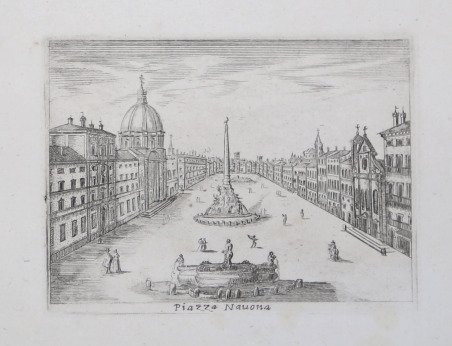 Rarissima veduta disegnata dal vivo ed incisa all’acquaforte da Philippe Pallot. La veduta apparterrebbe ad una serie di 12 tavole (alcune delle quali con data 1686 e firma P. Pallot del. inc.) incise da Philippe Pallot. La raccolta viene citata solo da Charles Le Blanc nel suo celebre Manuel de l'amateur d'estampes (1854/88), mentre non siamo riusciti a trovarne traccia in altra bibliografia. Abbiamo trovato esemplari conservati alla Bertarelli e alla Panizzi (una sola incisione in entrambe le raccolte) mentre 6 incisioni della serie risultano dalla vendita all’asta della collezione Petzold (1842) che le definisce già rare: “Suite de 6 est[ampes] rares, in– 8. Gravées à l’eau-forte et marques Fil. Pallot del. inc. 1686” (cfr. Benjamin Petzold, Catalogue de vente d'une belle collection d'estampes colligée par Benj. Petzold, p. 63, n. 916). Pochissime le notizie bibliografiche sull’autore, di cui queste sono probabilmente le uniche opere. Benezit lo descrive come “dessinateur et graveur au burin en 1680. Grava des vues de Rome”. Magnifica prova, impressa su carta vergata coeva, con margini intonsi, in perfetto stato di conservazione. Bibliografia cfr. Le Blanc, t. III, pag. 136; cfr. Benezit, p. 493; La raccolta di stampe Angelo Davoli: catalogo generale (2008), p. 66; P. Arrigoni, A. Bertarelli, Piante e vedute di Roma e del Lazio conservata nella Raccolta delle stampe e dei disegni (1931), p. 141. Very rare view drawn and etched by Philippe Pallot. The view would belong to a series of 12 plates (some of which are dated 1686 and signed P. Pallot del. inc.) engraved by Philippe Pallot. The collection is mentioned only by Charles Le Blanc in his famous Manuel de l'amateur d'estampes (1854/88), while we could not find any trace of it in other bibliographies. We found single works conserved at the Raccolta Bertarelli and at the Biblioteca Panizzi (only one engraving in both collections) while 6 engravings of the series result from the auction sale of the Petzold collection (1842) that defines them already rare: "Suite de 6 est[ampes] rares, in- 8. Gravées à l'eau-forte et marques Fil. Pallot del. inc. 1686" (see Benjamin Petzold, Catalogue de vente d'une belle collection d'estampes colligée par Benj. Petzold, p. 63, n. 916). There is very little bibliographical information on the author, of whom these are probably the only works. Benezit describes him as "dessinateur et graveur au burin en 1680. Grava des vues de Rome". Magnificent proof, printed on contemporary laid paper, with intact margins, in perfect condition. Bibliografia cfr. Le Blanc, t. III, pag. 136; cfr. Benezit, p. 493; La raccolta di stampe Angelo Davoli: catalogo generale (2008), p. 66; P. Arrigoni, A. Bertarelli, Piante e vedute di Roma e del Lazio conservata nella Raccolta delle stampe e dei disegni (1931), p. 141. Cfr.