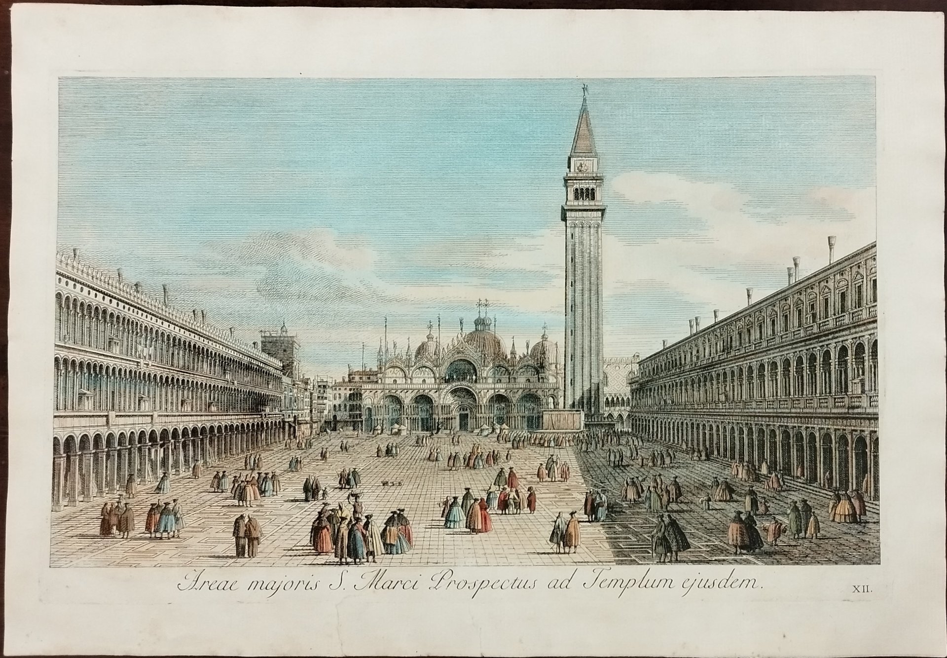 Incisione all'acquaforte in delicata coloritura di 432 x 275 mm. alla battuta su foglio di carta vergatina veneziana di 479 x 334 mm. Filigrana "Z". I stato su IV. Tiratura Pasquali. In basso al centro "Area majoris S. Marci Prospectus ad Templum ejusdem" e sulla destra "XII" in numero romano. Ottimo foglio a larghi margini. Due piccoli strappi restaurati al margine inferiore fuori dalla battuta. Incisione tratta dal più che celebre album inciso da Antonio Visentini dai disegni di Canaletto "Urbis Venetiarum Prospectus Celebriores, ex Antonii Canal Tabulis XXXVIII. Aere expressi ab Antonio Visentini. In partes tres distributi". Succi 2013 :"Le due opposte vedute di piazza S. Marco concludono la terza parte della raccolta visentiniana. Il dipinto di Canaletto appartiene alla collezione Earl Fitzwilliam.". Moschini "Dell'Incisione in Venezia" - Pallucchini "Mostra degli Incisori Veneti del 700" - Morazzoni "Il libro illustrato veneziano del 700" - Succi "Prospettive di Venezia" e " Da Carlevaijs a Tiepolo" - Montecuccoli degli Erri "Canaletto incisore". (EN)Etching in delicate coloring measuring 432 x 275 mm. at the bottom on a sheet of Venetian laid paper measuring 479 x 334 mm. "Z" watermark. I state on IV. Pasquali edition. At the bottom center "Area majoris S. Marci Prospectus ad Templum ejusdem" and on the right "XII" in Roman numeral. Excellent sheet with wide margins. Two small tears restored on the lower edge outside the edge. Engraving taken from the more than famous album engraved by Antonio Visentini from Canaletto's drawings "Urbis Venetiarum Prospectus Celebriores, ex Antonii Canal Tabulis XXXVIII. Aere expressi ab Antonio Visentini. In partes tres distributi". Succi 2013 :"The two opposite views of Piazza S. Marco conclude the third part of the Visentini collection. Canaletto's painting belongs to the Earl Fitzwilliam collection.". Moschini "Dell'Incisione in Venezia. " - Pallucchini "Mostra degli Incisori Veneti del 700" - Morazzoni "Il libro illustrato veneziano del 700" - Succi "Prospettive di Venezia" and "Da Carlevaijs to Tiepolo" - Montecuccoli degli Erri "Canaletto incisore".