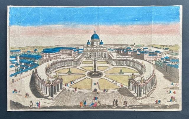 Incisione in rame all'acquaforte, 1770 circa, coeva coloritura d'epoca, cm 24,5 x 40,5 (il foglio). Bella veduta ottica realizzata in prospettiva centrale e con un insolito e geometrico disegno di impronta popolare. Rara. Margini leggermente rifilati e alcune pieghe verticali della carta, in bella coloritura, discreto stato. .