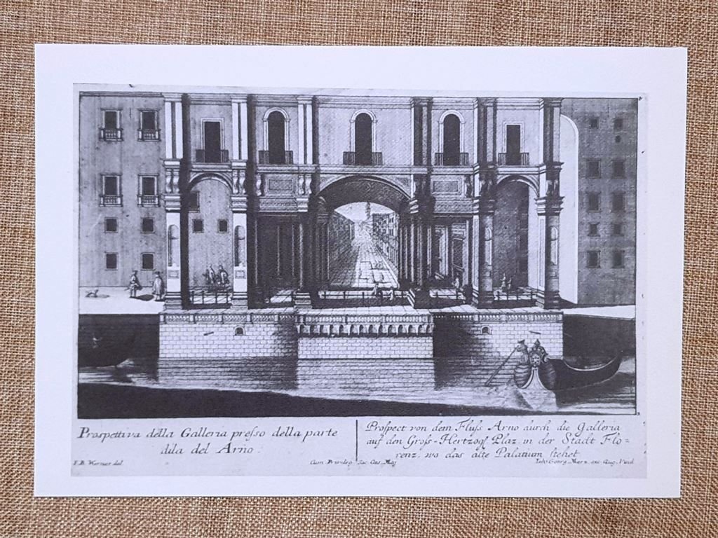 Rara stampa estratta da pubblicazione di fine ‘900 Incisione all’acquaforte del 1735 che raffigura Piazza Santa Croce animata dai festeggiamenti del carnevale. In primo piano, al centro della composizione, si erge una fontana monumentale, attorno alla quale si muove una folla vivace: maschere, cavalieri, dame in abiti eleganti e popolani intenti a godere dello spettacolo. Sul fondo domina la facciata della Basilica di Santa Croce, affiancata dai palazzi storici che delimitano la piazza. L’artista, seguendo il disegno di Friedrich Bernhard Werner, unisce precisione topografica e gusto scenografico, tipico delle vedute settecentesche destinate a un pubblico internazionale. La prospettiva centrale e il tratteggio raffinato di Johann Georg Merz restituiscono l’ampiezza dello spazio urbano e l’atmosfera festosa della ricorrenza, trasformando la piazza in un palcoscenico di vita cittadina. E Autore da identificare. Incisione prospettica che ritrae il fronte meridionale del Palazzo Vecchio e la sua galleria di collegamento con gli Uffizi, osservati dal versante dell’Arno. Dimensioni fronte/retro: Cm 21,00 x 15,00 + Cm 21,00 x 15,00 Codice prodotto: X - 45 PayPal Carta di credito Bonifico bancario Inserita dentro plico di adeguate dimensioni per proteggerne l'integrità Spedizione con posta ordinaria o raccomandata scelta dall’Acquirente nel momento del pagamento Clicca qui per accedere al nostro Store ed al suo sterminato archivio