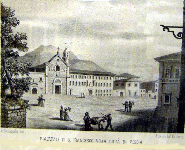 PIAZZALE DI SAN FRANCESCO NELLA CITTÀ DI PESCIA. Litografia originale di G.Castagnola.
