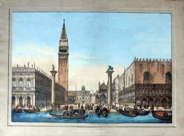 1860 circa. Litografia stampata a colori e ritoccata a mano in colore d’epoca, cm 45 x 61,5 (il foglio). Bella veduta prospettica della piazza, riccamente animata e vivace. Doppio filetto nero e bianco di inquadratura e passepartout grigio a gouache. Difetti marginali ma buona tutta la figurazione.
