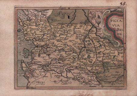 Carta geografica tratta dal rarissimo Itinerarium Europae Provinciae edito a Colonia tra il 1579 e il 1588. Conosciuto anche come Itinerarium Orbis Christiani, questo atlante fu pubblicato anonimamente a causa dei problemi politici e religiosi che caratterizzavano il periodo storico, come spesso succedeva aal'epoca per sfuggire alle persecuzioni cattoliche contro i protestanti. L'opera fa parte degli atlanti editi dalla cosidetta scuola Cartografica di Colonia, durata per circa mezzo secolo (1570-1620 ca.), e formata principalmente da rifugiati fiamminghi ed olandesi tra i quali spiccano lo stesso Matthaeus Quad e Frans Hogenberg, che ne fu il fondatore. Le mappe sono attribuite alcune a Jan Matal ed altre a Michael von Eitzing. Jan Matal o Metellus, francese di nascita ed attivo a Louvaine ed a Colonia, dove si rifugia prprio per sfuggire alle persecuzioni dei regnanti cattolici e dove muore nel 1597. Fu tra i maggiori cartografi del tempo e, insieme al Quad e al Hogenberg stesso, il principale esponente della scuola coloniese. Alcune delle mappe del Matal sono poi successivamente incluse nelle successive pubblicazioni postume, e recano il testo al verso. Dal punto di vista cartografico le mappe sono una derivazione e basate sulle carte pubblicate ad Anversa da Abraham Ortelius, per la prima volta nel 1570; le incisioni delle mappe sono invece attribuite a Frans Hogenberg. La grandissima rarità dell'opera, insieme alla scarsità di informazioni sulle opere "carbonare" edite a Colonia, contribuisce al fascino di questa importante mappa, caposaòdo di ogni collezione cartografica. Incisioni in rame, magnifica coloritura coeva, in buono stato di conservazione. Opera di incredible rarità, mancante in praticamente tutte le collezioni. Esemplare di primo stato, avanti il numero. Meurer Atlantes Colonienses Die Kolner Schule der Atlas Kartographie 1570-1610; Meurer IOC 8 Map from the very rare Initerarium Europae Provinciae, published in Cologne between 1579 and 1588. Also known as Itinerarium Orbis Christiani, this atlas was published anonymously due to the political and religious problems that characterized that particular period, i.e., the persecutions suffered by the Protestants who were threatened by the Catholics. The work belongs to the atlases published by the so called Cartographic school of Cologne, whose works were published along fifty years (1570-1620). The school was mainly made of Flemish and Dutch refugees among which Mattheaus Quad and Frans Hogenberg, the founder of the institution. The maps have been ascribed to Jan Matal and Michale von Eitzing. Jan Matal, or Metellus, was born in France and worked in Louvaine and Cologne, where he fled to escape the Catholic persecution and where he died in 1597. He was considered one of the greatest cartographers of his time and one of the most important artists of the school of Cologne, together with Quad and Hogenberg. some of his maps have been afterwards included in some posthumous works with the text on verso. From a cartographic point of view, the maps derive from those published by Abraham Ortelius in Antwerp in 1570; the engravings instead have been ascribed to Frans Hogenberg. The rarity of this work, together with the lack of information on the secret works published in Cologne confer a particular charm to this map, a bench mark for every collector. Copper engravings, magnificent contemporary colours, in very good condition. Extremely rare work, not present in any collection. Example in the first state, before the number was added. Meurer Atlantes Colonienses Die Kolner Schule der Atlas Kartographie 1570-1610; Meurer IOC 8 Cfr.
