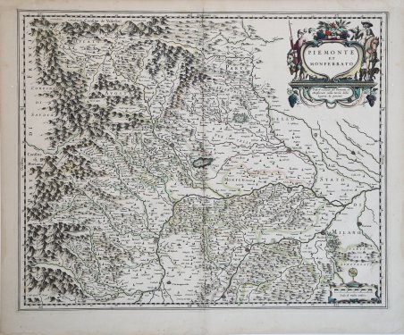 Carta geografica tratta da Le Theatre du Monde ou Nouvel Atlas edizione francese del 1640. Conosciuta come “carta del falconiere”, per il cartiglio, l’opera proviene dal volume terzo del celebre “Theatrum” di Willem e Johannes Blaeu. Willem Janszoon Blaeu, avviò nel 1599 la sua attività di costruttore di globi e strumenti astronomici ad Amsterdam. Nel 1630, dopo aver comprato alcune lastre dell’atlante del Mercator da Jodocus Hondius II, fu in grado di pubblicare un volume di 60 mappe con il titolo di ' Atlantis Appendix. Cinque anni dopo, pubblicò i primi due volumi del suo atlante ' Atlas Novus ' o ' Theatrum Orbis Terrarum, ' in sei libri. Dopo la sua morte, Joan (Johannes) continuò l’opera paterna, completando l’intera serie di sei volume dell’Atlas Novus ' intorno al 1655. Fu inoltre autore di un ' Atlas Maior sive Cosmographia Blaviana, in 12 volumi pubblicati nel 1662 -72, dei quali uno dedicato all'Italia. La carta compare per la prima volta nel terzo volume del ' Theatrum. ' Secondo Koeman viene pubblicata in primis nell'edizione francese del 1640, dal titolo ' Le Theatre du Monde ou Nouvel Atlas, ' Mis en lumiere par Guillaume & Jean Blaeu. ' Troisieme partie. A Amsterdam, Chez Iean & Corneille Blaeu MDCXL. Il terzo volume del ' Theatrum ' contiene 58 carte dell'Italia e 4 della Grecia (cfr. Koeman, ' Atlas Neerlandici, pp. 160-162, Bl 35A). Le carte dell'italia derivano tutte dall'opera di Giovanni Antonio Magini. Tuttavia, sembra più probabile che il Blaeu si basi sue quelle di Hendrick Hondius e Johannes Janssonius pubblicate nel ' Theatrum Italiae in quo Eius Regna, Domina, Ducatus, Et Speciatim Illorum Provinciae, Tabulis Accuratissimis, Iam, De Novo in Lucem Editio, Describunter, Quorum Sequens Pagina Indicabit, stampato ad Amsterdam da Hendrick Hondius nel 1636. ' Sebbene pubblicate dopo la morte di Willem Janszoon Blaeu (1638) le carte spesso recano il suo imprint. Non è dato sapere se fossero tutte già pronte o se i figli Johannes e Cornelis le compilarono postume. Incisione in rame, coloritura coeva, in ottimo stato di conservazione. Striking wide margined example of Blaeu's decorative map of ' Piedmont. Willem Janszoon Blaeu, started in 1599 his business as a builder of globes and astronomical instruments in Amsterdam. In 1630, after buying some plates of the Mercator atlas from Jodocus Hondius II, he was able to publish a volume of 60 maps under the title ' Atlantis Appendix. Five years later, he published the first two volumes of his atlas ' Atlas Novus ' or ' Theatrum Orbis Terrarum, in six books. After his death, Joan (Johannes) continued his father's work, completing the entire six-volume ' Atlas Novus ' series around 1655. He was also the author of an ' Atlas Maior sive Cosmographia Blaviana, in 12 volumes published in 1662 -72, one of which was devoted to Italy. The map first appears in the third volume of the Theatrum. According to Koeman it is first published in the French edition of 1640, entitled Le Theatre du Monde ou Nouvel Atlas, Mis en lumiere par Guillaume & Jean Blaeu. Troisieme partie. In Amsterdam, Chez Iean & Corneille Blaeu MDCXL. The third volume of the Theatrum contains 58 maps of Italy and 4 of Greece (see Koeman, Atlas Neerlandici, pp. 160-162, Bl 35A). The maps of Italy are all derived from the work of Giovanni Antonio Magini. However, it seems more likely that Blaeu relies on those of Hendrick Hondius and Johannes Janssonius published in Theatrum Italiae in quo Eius Regna, Domina, Ducatus, Et Speciatim Illorum Provinciae, Tabulis Accuratissimis, Iam, De Novo in Lucem Editio, Describunter, Quorum Sequens Pagina Indicabit, printed in Amsterdam by Hendrick Hondius in 1636. Although published after the death of Willem Janszoon Blaeu (1638) the maps often bear his imprint. It is not known whether they were all ready-made or if his sons Johannes and Cornelis completed them posthumously. Copperplate, in very good conditions. Cfr. Keoman Bl 35A , 2.