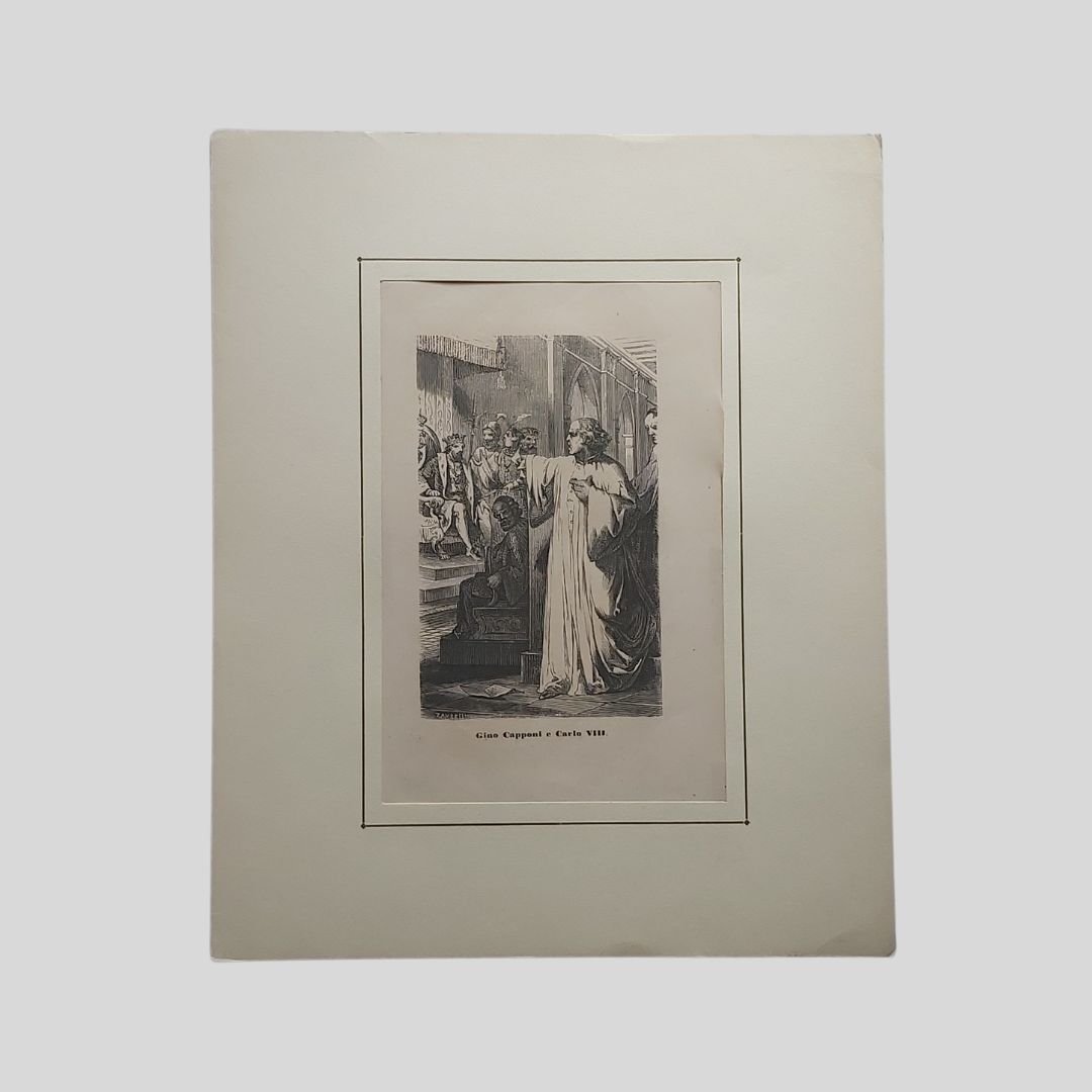 Xilografia di Zambelli. In didascalia è riportato il nome di Gino (sic!). Senza data, dopo il 1850, mm 159×96 (alla battuta), mm 228×138 (tavola). Montata su passepartout, mm 262×138. In buone condizioni.