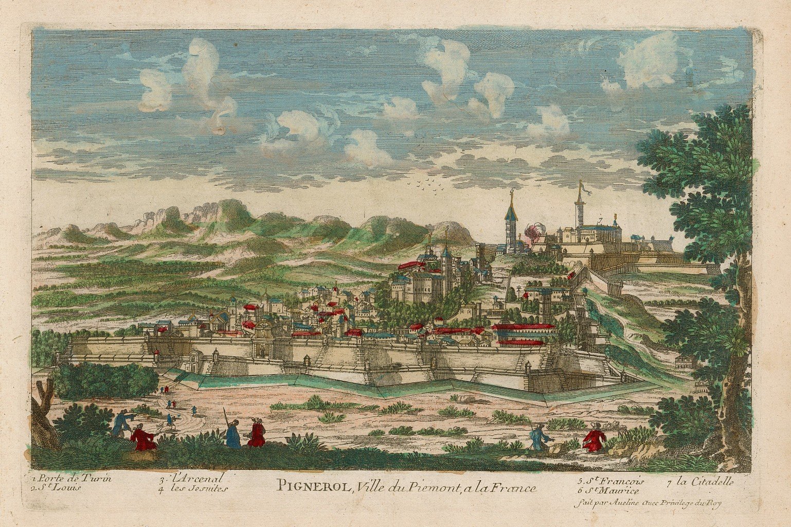 Animata veduta prospettica della città di Pinerolo. L'incisione è caratterizzata da una vivace coloritura coeva all'acquerello. Rara a reperirsi nelle presenti condizioni. Autore: Aveline dis. Luogo: Pinerolo. Anno: 1700 ca. Tecnica: incisione in rame. Dimensioni: 190x312 mm.
