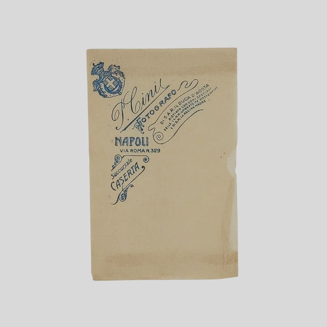 Pilade Cini Fotografo di S.A.R. il Duca d’Aosta. Napoli via Roma n. 239. Succursale in Caserta. Bustina in carta mozzarella con apertura laterale, mm 150x100.