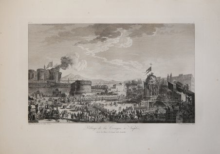 Veduta incisa da Du Plebis e pubblicata nel ' Voyage Pittoresque ou description des Royaumes de Naples et de Sicile, opera in 5 volumi per la prima volta stampati a Parigi tra 1781 e il 1786. Richard de Saint-Non conobbe, durante il suo viaggio a Roma, i due già celebri pittori francesi Jean Honoré Fragonard e Hubert Robert, con i quali prosegue il suo viaggio per tutto il paese. Da questa grande amicizia nasce l’idea e la collaborazione per l’ambizioso progetto di documentare graficamente tutti i principali monumenti dell’Italia Meridionale e della Sicilia. Da qui, tra il 1781 ed il 1786, con l’aiuto di numerosi ed importanti architetti, pittori ed incisori, venne alla luce il Voyage Pittoresque ou description des Royaume de Naples et de Sicilie, opera composta di cinque volumi che uscirono annualmente. Incredibile sforzo tipografico, l’opera raccoglie quasi per intero gli appunti di viaggio del Saint-Non, adeguatamente assemblati e corretti; il corpus grafico è composto di ben 542 incisioni all’acquaforte e bulino, opera dei principali artisti di riproduzione del periodo. Da un punto di vista editoriale l’iniziativa riscuote immediatamente un grandissimo successo: il libro diviene un vero e proprio modello tipografico, sul quale sono basate diverse pubblicazioni dell’impero napoleonico. Dal punto di vista artistico le vedute, i paesaggi e le rovine conservano, e non può essere altrimenti, lo stile pittorico e romantico del Fragonard, del Robert, del Desprez, e di tutti gli altri artisti che collaborano nella realizzazione di questa monumentale opera. Il notevole successo commerciale della raccolta è testimoniato dalla ristampa, tra il 1795 ed il 1798, delle sole tavole pittoriche. Un’ulteriore edizione è stampata nel 1829 dal Dufour. Esemplare tratto dal ' Voyage Pittoresque, ' seconda edizione del 1795/98, priva dell’indicazione del privilegio reale. ' Acquaforte, stampata su carta vergata coeva, leggere ossidazioni, per il resto in ottimo stato di conservazione. View engraved by Du Plebis and taken from the Voyage Pittoresque ou description des Royaume de Naples et de Sicilie by Richard de Saint-Non. During his trip to Rome, Richard de Saint-Non met two already famous French painters, Jean Honoré Fragonard and Hubert Robert, with whom he travelled along Italy. Their friendship led to the cooperation for the ambitious project of depicting all the main monuments of Southern Italy and Sicily. Between 1781 and 1786, with the assistance of many contemporary artists, he realized the Voyage Pittoresque ou description des Royaume de Naples et de Sicilie, a five volumes work published annually. As a result of a great typographical effort, the work is a collection of Sain-Non’s travelling notes; the graphic part is made up of 542 engravings and etchings, realized by the most important artists of the period. The work is immediately successful, for the book became a new typographical model for the following publications. From an artistic point of view, the views, landscapes and antiquity keep the Romantic pictorial style of Fragonard, Robert, Desprez and all the other artists that took part in this monumental project. The re-issue, between 1795 and 1798, of the pictorial plates, witnesses the great success of this project. A re-issue of the whole work was edited in 1829 by Dufour. ' Example taken from the second edition of the work, printed in Paris 1795/98; the plates are without the Royal priviledge. ' Etching, printed on contemporary laid paper, light foxing, otherwise good condition. Cfr.