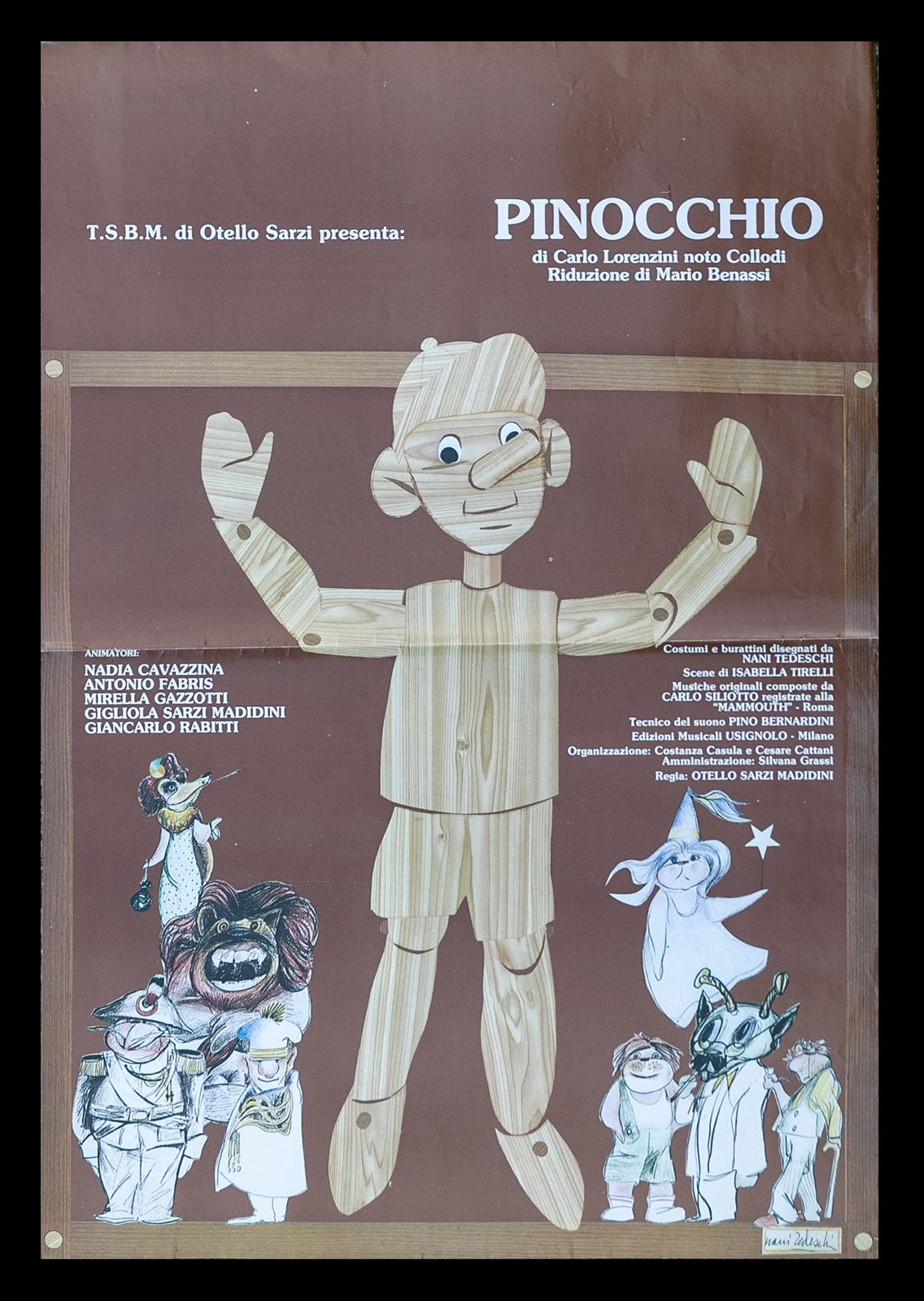 Di Collodi (Carlo Lorenzini), regia Otello Sarzi Madidini. Compagnia T.S.B.M. di Starzi, Grafica Tedeschi. Esemplare ripiegato più volte, leggera usura ai margini