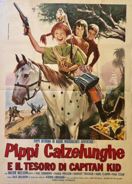 Manifesto in offset, cm 100 x 140. Originale edizione italiana del 1970 circa. Manifesto con alcuni normali strappetti marginali ma assolutamente in buono stato di conservazione. Pippi Calzelunghe (in lingua svedese Pippi Långstrump) è un grande classico della letteratura per l’infanzia, un personaggio immaginario nato dalla penna della scrittrice svedese Astrid Lindgren. Il romanzo è del 1945, l'omonima serie televisiva del 1969. Il film, una produzione svedese – tedesco, porta le regia di Olle Belbom e ha come interprete Inger Nelson. Il nome "Pippi Calzelunghe" fu inventato dalla figlia della scrittrice che, costretta a letto malata, chiese alla madre di raccontarle la storia di un personaggio frutto della sua fantasia. Fu così che Astrid Lindgren iniziò a scrivere una serie di brevi racconti che questo nome bizzarro potesse ispirarle, creando un personaggio la cui missione fosse quella di risolvere quanto più possibile tutti i problemi, ciò grazie all'aiuto di super poteri, di una fervida immaginazione e di tanto altruismo. Pippi Calzelunghe vuole essere un inno alla libertà di pensiero, al coraggio di criticare le ingiustizie, al diritto di sognare mondi alternativi. Il romanzo si divide in ventiquattro racconti. Una bambina eccezionale piomba all'improvviso nella tranquilla cittadina svedese di Visby (nell'isola di Gotland) e va a vivere da sola a Villa Colle (Villekulla). Effettivamente Pippi è in compagnia di un cavallo bianco a pois neri (razza Knabstrup), che lei chiama zietto, e di una scimmietta, il signor Nilsson. L'aspetto vivace della casa (colorata in verde, giallo e rosa) attira subito l'attenzione degli abitanti della cittadina; in particolare quella di due bambini, Tommy e Annika di dieci anni che, incuriositi, accedono di soppiatto all'interno della villa e trovano una bambina loro coetanea, che si sta riposando con la testa ai piedi del letto e i piedi (con buffe scarpe di misura più grande) sul cuscino. Incuriositi i bambini fanno presto amicizia con la simpatica inquilina della villa e presto scopriranno che tiene in casa una grossa borsa con monete antiche di inestimabile valore, frutto a suo dire dei tesori misteriosi trovati dal padre, pirata nei mari del Sud. È dotata di una forza prodigiosa, ai limiti del paranormale, che subito metterà in atto alzando di peso il suo cavallo e facendo lo stesso con l'auto di due malcapitati poliziotti. .