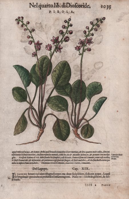 Opera tratta da ' I discorsi di M. Pietro Andrea Matthioli sanese, medico cesareo, et del serenissimo prencipe Ferdinando arcidvca d'Austria & c. Ne i sei Libri di Pedacio Dioscoride Anazarbeo della materia medicinale. ' Con dedica alla Principessa Giovanna, arciduchessa d’Austria (il Mattioli era medico reale), escono in volgare, nel 1568, i sei libri ' di nuovo dallo istesso autore ricorretti, & in più di mille luoghi aumentati. Con le figure grandi tutte di nuovo rifatte, & tirate dalle naturali & vive piante & animali, & in numero maggiore che le altre per avanti stampate. ' Lo stesso Pietro Andrea Mattioli presenta così la nuova edizione del libro, che già ha ricevuto molti consensi e che toccherà il culmine del successo grazie, appunto, alla forma di presentazione molto più organica, alla completezza delle informazioni, e, soprattutto, alla ricchezza e alla chiarezza delle illustrazioni. ' Chi sapesse tutte le virtù delle piante farebbe miracoli: questo enunciato dell’autore sembra animare per primo proprio lui, che va a cercare con certosina pazienza ogni minimo appiglio per lodare le virtù medicinali di ogni erba, raccontando ogni aneddoto, scoprendo ogni notizia curiosa, riportando ogni considerazione fatta sull’argomento da altri studiosi prima di lui. ' Il tono enciclopedico dell’opera si avverte, in maniera evidente, fin dalla dedica. Il discorrere dell’autore, le cui radici toscane o, per meglio dire, senesi non si smentiscono, è agile, piano, adatto ad un pubblico ampio, anche meno colto e poco preparato ma che, in qualche maniera, faceva parte del vasto mondo della medicina e della farmacia del tempo. Non è un caso che il testo sia tra quelli rimasti più a lungo in uso, anche nel piccolo bagaglio librario di famiglie povere o quasi analfabete. ' Alla sostanziosa dedica segue un proemio dedicato agli addetti ai lavori e le solite lettere di complimenti. Seguono due copiose tavole, cioè due indici: uno analitico per tutte le voci, l’altro per patologie. ' L’opera vera e propria inizia con il ritratto a piena pagina di Mattioli e illustra, in sequenza, le piante medicinali (concentrate nei primi quattro libri) e una serie di preparazioni (oli, unguenti, ecc.). Per Mattioli l’occasione è ghiotta sia per potersi dilungare sulla esatta identificazione delle specie, mostrando una vasta preparazione botanica, sia, soprattutto, per mostrare le splendide immagini delle piante, che, a volte, sono anche più di una per esemplare e messe a confronto, qualora il lettore avesse dubbi. Il secondo libro è dedicato in parte agli animali marini (ricci, spugne, seppie, pesci, ecc.) in parte a quelli terrestri (lepri, capriolo, castoreo, rospo, ecc.), comprese le vipere e le api con relativi prodotti (miele, cera, propoli, ecc.). Il quinto libro è dedicato ai minerali e il sesto ai veleni. ' Di ogni voce viene riportato il testo di Dioscoride tradotto in italiano, un esame moderno di identificazione con analogie e confronto dei pareri di autori diversi poi le virtù e i nomi in più lingue. ' Un’opera che ha lasciato il segno nella letteratura medica e farmaceutica del Rinascimento e che, ancora oggi, sprizza fascino ad ogni pagina. Plate taken from ' I discorsi di M. Pietro Andrea Matthioli sanese, medico cesareo, et del serenissimo prencipe Ferdinando arcidvca d'Austria & c. Ne i sei Libri di Pedacio Dioscoride Anazarbeo della materia medicinale ' printed in Venice by Vincenzo Valgrisi.Mattioli's Italian translation of the works of Dioscorides. ' Mattioli (1501-1577) was a Siennese doctor and naturalist. He described more than one hundred new plants and contributed to the development of medical botany. This, his most important work, was first printed in 1544 in Italian, 1554 in Latin, French in 1561, Czech in 1562, and in German in 1563. ' The wood cuts in his work were accurate and standardized enough to allow for easy identification. While nominally a commentary on the work of the botanist Dioscordies, Mattioli significantly expanded the work by adding major new contributions. He relied in part on the contributions of the Turkish diplomat, Buscecq, his doctor, Quakelbeen, and the famed botanist, Luca Ghini, who founded the botanical garden in Pisa. ' In this work, Mattioli significantly provided the first known observation of a tomato being grown and eaten in Italy.Woodcut with fine later hand colour, good condition. Cfr.