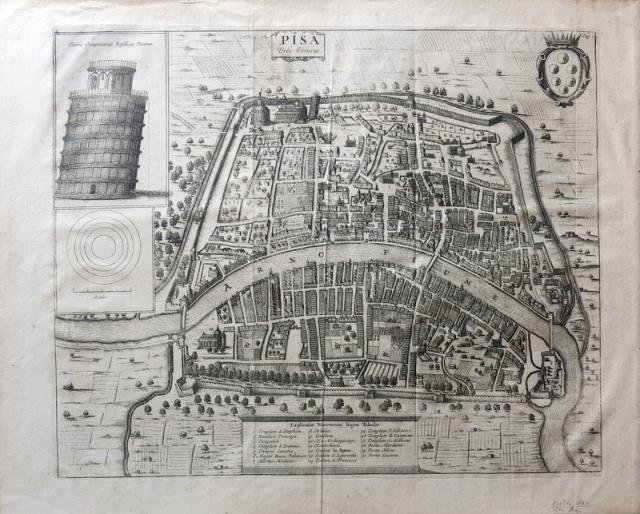 Petrus Van Der Aa, Leida, 1715 circa. Tratta dal “Thesaurus antiquitatum et historiarum Italiae, Neapolis, Siciliae, Sardinae, Corsicae, melitae, atque adjacentium terrarum insularumque.”, colossale opera storiografica in trenta volumi, rarissima a trovarsi completa, di Joannes Georgius Graevius e data alle stampe da Petrus Vander Aa. Incisione in rame all'acquaforte, b/n , cm 34,9 x 42, 3 (alla lastra) più ampi margini. Il Graevius (Naumburg, 1632 – Utrecht, 1703) fu un celeberrimo studioso e critico tedesco di storia antica; le sue due più importanti opere furono la “Antiquitatum Thesaurus Romanarum” (1694 -1699, in 12 volumi), e il “Thesaurus Antiquitatum et Historiarum Italiae”, pubblicato dopo la sua morte con il prosieguo di Burmann Pieter il Vecchio. (Cfr. D. Cremonini, “L'Italia nelle vedute e carte geografiche dal 1493 al 1894”; J. G. T. Graesse, “Trésor de livres rares et précieux”). Grande, bella e rara pianta prospettica della città di Pisa con venti rimandi delle cose notabili, in basso al centro, stemma mediceo in alto a sinistra e un riquadro in alto a destra con la “Turris Campanariae Basilicae Pisanae”. Buon esemplare. .