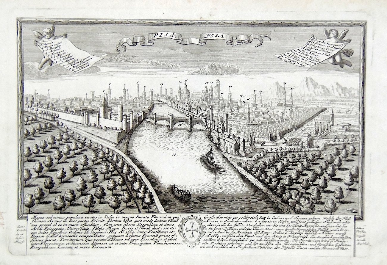 Incisione in rame, mm 205x305. Bella veduta generale della città colta da est lungo l'Arno. In basso un riquadro contiene note storiche, ripetute in tedesco. Ottimo esemplare.