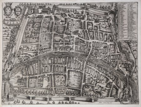In alto a sinistra sono rappresentati lo stemma della famiglia Medici e quello della città di Pisa e, in un piccolo cartiglio, è inciso il titolo: ' PISA. ' Nel riquadro in alto destra si trovano i ' LUOGHI NOTABILI, una legenda numerica di 91 rimandi, suddivisi su due colonne. Segue, sempre all’interno del riquadro, la firma ' ACHILLE SOLI PITORE FECIT. In basso a destra è inciso l’imprint editoriale: ' Matteo florimi formis Siena. Pianta prospettica della città disegnata da Achille Soli, stampata a Siena da Matteo Florimi. La pianta è il primo vero ritratto della città, modello per tutte le planimetrie successive. Nell’angolo in alto a sinistra, lo stemma mediceo e la croce pisana. L’edilizia comune è restituita con un semplice modulo indifferenziato, ma anche gli edifici più importanti (ad esempio il palazzo granducale) e le chiese sono rappresentati in modo approssimativo o addirittura scorretto, e spesso con i prospetti frontali girati verso l’osservatore. La datazione della lastra è stata assegnata tra il 1603, anno in cui fu costruita la tettoia del Sostegno sul Canale dei Navicelli - che è rappresentata nella pianta e costituisce un sicuro ' terminus post quem, ed il 1607, anno in cui Giovanni Orlandi ne realizza una copia a stampa. Achille Soli potrebbe essere stato anche l’autore dell’intaglio sul rame, ma è anche probabile che l’incisione sia stata realizzata all’interno della bottega senese di Matteo Florimi. Achille Soli (Pisa, fine XVI – primi XVII) è qualificato come ' Achille Soli pittore pisano ' nel registro di Entrate e Uscite del Giardino dei Semplici e documentato tra i collaboratori all’ingente produzione iconografica del Giardino, almeno a partire dal 1605. Nel 1610 risulta tra i creditori dello Studio per il disegno di una monumentale Pianta del Giardino dei Semplici incisa su sei lastre da un non meglio identificato “Stefano di Paolo” Genovese e stampata da G. Fontani nel 1613. Matteo Florimi (Polistena 1540 circa – Siena 1613) fu editore e commerciante di libri e di stampe. Di origini calabresi, si stabilì a Siena nel 1581, con un negozio in Banchi. L’attività calcografica di Matteo Florimi fu più volte affiancata da veri e propri maestri incisori come Cornelis Galle, Arnoldo degli Arnoldi, Pietro de Iode, Jan Sadeler e artisti come Francesco Vanni, Ventura Salimbeni e Alessandro Casolani, con i quali lo stampatore ha collaborato per la preparazione di soggetti sacri. L’attività cartografica del Florimi produsse stampe di moltissime città e territori di tutto il mondo, che non furono mai disegnati per lui, ma furono manipolazioni di rilievi già esistenti, o di carte edite da altri stampatori. Nella seconda metà del XVI secolo la curiosità geografica e il desiderio di viaggiare, erano molto sentiti, e il Florimi fu lungimirante nel dedicarsi alla produzione di vedute di città a volo d’uccello il più possibile fedeli, destinate a mostrare luoghi mai visti difficilmente visitabili. ' ' Il Florimi si inserì perfettamente in questo filone di mercato e contribuì al perfezionamento della nuova “ondata” di rappresentazioni cartografi che copiando alcune stampe di Antonio Lafreri, Claude Duchet, Abraham Ortelius e venendo a sua volta contraffatto. Per quanto riguarda il lavoro di incisione delle carte, nel 1600, Matteo Florimi chiamò a lavorare presso la sua bottega l’incisore fiammingo Arnoldo degli Arnoldi con la promessa di un maggior compenso rispetto a quello che gli elargiva Giovanni Antonio Magini, presso cui l’artista operava. Quest’offerta del Florimi scatenò le ire del Magini che, pur senza farne il nome, lo chiama “invidioso contraffattore” per avergli sottratto un così abile cartografo. La collaborazione tra il Florimi e l’Arnoldi durò solo due anni (1600-1602), ma fu abbastanza produttiva: insieme stamparono lo ' Stato di Siena, ' la ' Choronografia Tusciae, ' la Nuova descrittione della Lombardia, l’Europa, l’America?. The coat of arms of the Medici family and the coat of arms of the city of Pisa are depicted in the upper left and, in a small cartouche, is engraved the title: PISA. In the upper right box are the LUOGHI NOTABILI, a numerical legend of 91 cross-references, divided into two columns. It is followed, again within the frame, by the signature ACHILLE SOLI PITORE FECIT. Engraved at lower right is the editorial imprint: Matteo florimi formis Siena. Map of the city drawn by Achille Soli, printed in Siena by Matteo Florimi. The plan is the first true portrait of the city, a model for all subsequent works. In the upper left corner is the Medici coat of arms and the Pisan cross. The common buildings are rendered in a simple undifferentiated form, but even the most important buildings (e.g., the grand ducal palace) and churches are represented roughly or even incorrectly, and often with the front elevations turned toward the viewer. The dating of the plate has been assigned between 1603, the year in which the canopy of the Sostegno was built on the Navicelli Canal - which is depicted in the plan and is a sure terminus post quem - and 1607, the year in which Giovanni Orlandi made a printed copy. Achille Soli may also have been the author of the copperplate carving, but it is also likely that the engraving was made within the Sienese workshop of Matteo Florimi. Etching and engraving, a dark impression on contemporary laid paper with watermark "deer in a shield with crown" (similar to Woodward nos. 51/53), with margins, in perfect condition. Rare work, surveyed for only 13 institutional examples according Bifolco-Ronca (see Cartografia e Topografia Italiana del XVI secolo, p. 2310). For quality of impression and state of preservation, the best example ever seen. Matteo Florimi (Polistena c. 1540 - Siena 1613) was a publisher and merchant of books and prints. Of Calabrian origin, he settled in Siena in 1581, with a store “in Banchi”. Matteo Florimi's chalcographic activity 