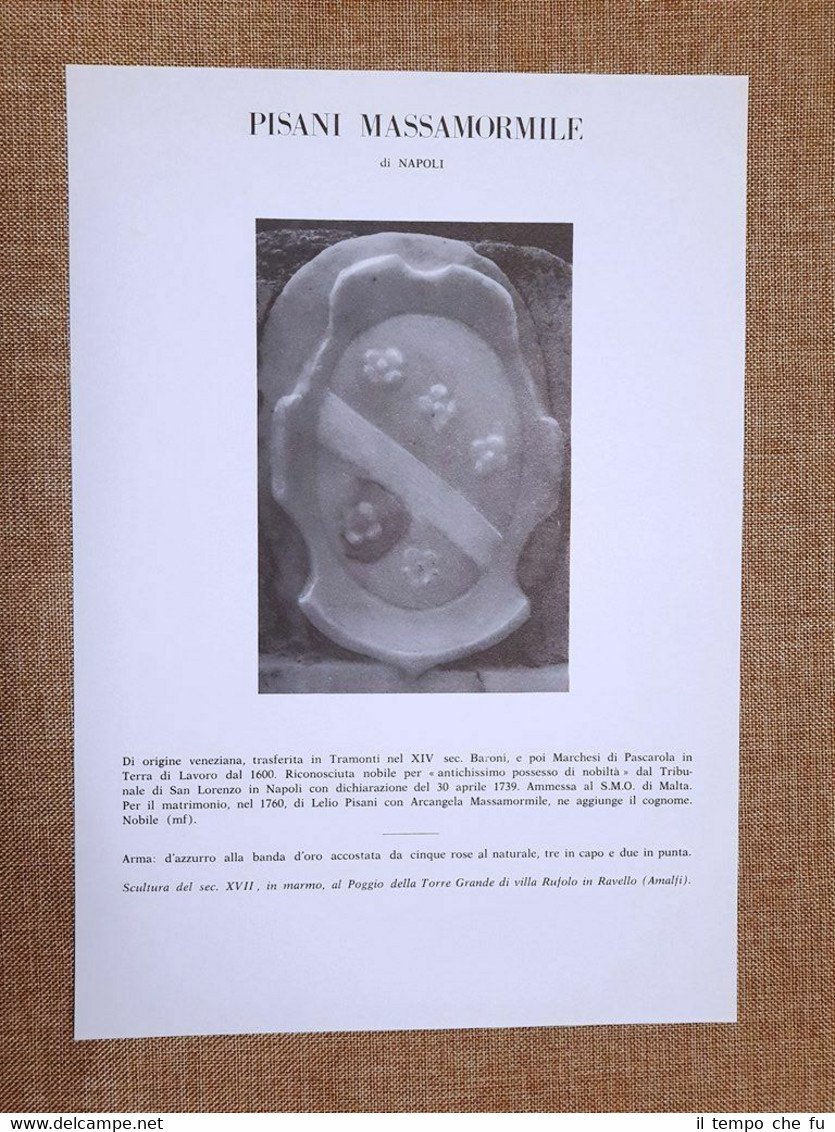 Rara tavola estratta da pubblicazione di metà '900 Stampata su carta speciale non retroscritta Pisani di Massamormile di Napoli Presente dettagliata storia dell'illustre Famiglia e Analitica descrizione dell'arma Stemma Famiglia Nobile Nobiltà Araldica Dimensioni fronte/retro: Cm 21,00 x 30,00 Codice prodotto: II1897-059 Qualora vogliate delle scansioni migliori contattateci, soddisferemo ogni vostra richiesta. Paypal Carta di credito Bonifico bancario Accuratamente adagiate su un cartoncino e protette da pellicola trasparente rigida, il tutto viene inserito dentro plico di adeguate dimensioni per proteggerne l'integrità.