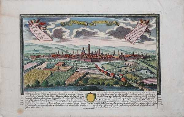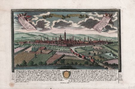 Bella e rara veduta panoramica della città delineata sulla scia della più grandi vedute disegnate da Fredrich Bernhard Werner e pubblicata ad Augsburg dagli eredi dell’editore Jeremias Wolff (1663-1724), Georg Balthasar Probst (1673-1750) – suo genero – e il suo successore, il figlio Johann Friedrich (1719-1781). Werner, nato a Reichenau, fu disegnatore, incisore, ingegnere e scenografo; durante la sua intensa vita viaggiò a lungo in vari stati europei prima in qualità di soldato poi come semplice viaggiatore, realizzando numerosi disegni dei luoghi visitati. Dopo aver trascorso un periodo di studio ad Augsburg collaborando con l’incisore K. Remshard, nel 1730 egli intraprese un viaggio in Italia, visitando molte città della penisola, per poi diventare ingegnere e scenografo del re di Prussia. La sua vasta produzione comprende una molteplicità di lavori dedicati a luoghi e città di vari paesi europei – Polonia, Olanda, Francia, Italia – soffermandosi in particolare sulla sua patria, alla quale sono dedicate le immagini della “Scenografia urbium Silesiae”, edita dagli eredi di Johann Baptist Homann a Norimberga. Werner può essere considerato uno dei più prolifici disegnatori della sua generazione, uno degli ultimi grandi personaggi che nel corso del Settecento si dedicano alla realizzazione del ritratto di città rappresentando la struttura urbana nella sua interezza, nel solco di una tradizione ormai secolare; nel corso del secolo le logiche che si affermeranno saranno invece da un lato quelle che frantumeranno la città in più immagini, dall’altro quelle che porteranno alla definitiva affermazione della topografia scientifica. Le immagini del Werner costituiscono un modello per la realizzazione di alcune altre vedute edite in Europa. Tra queste vanno ricordate quella dell’editore viennese Christofer Haffner (1668-1754), attivo probabilmente tra il 1720 e il 1750, e quelle di Johann Christian Leopold (1699-1755). Il Leopold, era un modesto incisore ed editore di Augsburg; la sua serie di vedute di città, da cui questa incisione è tratta, venne pubblicata con pochissima tiratura, rendendo quindi le opere particolarmente rare. Incisione in rame, in ottimo stato di conservazione. Beautiful and rare panoramic view of the city sketched in the wake of the greatest views drawn by Fredrich Bernhard Werner and published in Augsburg by the heirs of publisher Jeremias Wolff (1663-1724), Georg Balthasar Probst (1673-1750) - his son-in-law- and his successor, his son Johann Friedrich (1719-1781). Werner, born in Reichenau, was a draughtsman, engraver, engineer and stage designer; during his busy life he traveled extensively in various European states first as a soldier then as a simple traveler, producing numerous drawings of the places he visited. After spending a period of study in Augsburg working with engraver K. Remshard, he undertook a trip to Italy in 1730, visiting many cities on the peninsula, later becoming engineer and set designer to the King of Prussia. His vast output includes a multiplicity of works devoted to places and cities in various European countries - Poland, Holland, France, Italy - dwelling particularly on his homeland, to which the images of the "Scenografia urbium Silesiae", published by the heirs of Johann Baptist Homann in Nuremberg, are dedicated. Werner can be considered one of the most prolific draughtsmen of his generation, one of the last great figures during the eighteenth century to devote himself to the creation of the city portrait by depicting the urban structure in its entirety, in the wake of a tradition that was now centuries old; in the course of the century, the logics that would assert themselves would instead be, on the one hand, those that would break the city into several images, and on the other, those that would lead to the definitive establishment of scientific topography. Werner's images provide a model for the creation of a number of other views published in Europe. These include those of the Viennese publisher Christofer Haffner (1668-1754), active probably between 1720 and 1750, and those of Johann Christian Leopold (1699-1755). Leopold, was a modest Augsburg engraver and publisher; his series of city views, from which this engraving is taken, was published with very few print runs, thus making the works particularly rare. Copperplate engraving, in very good condition. Cfr.