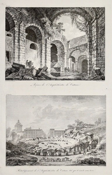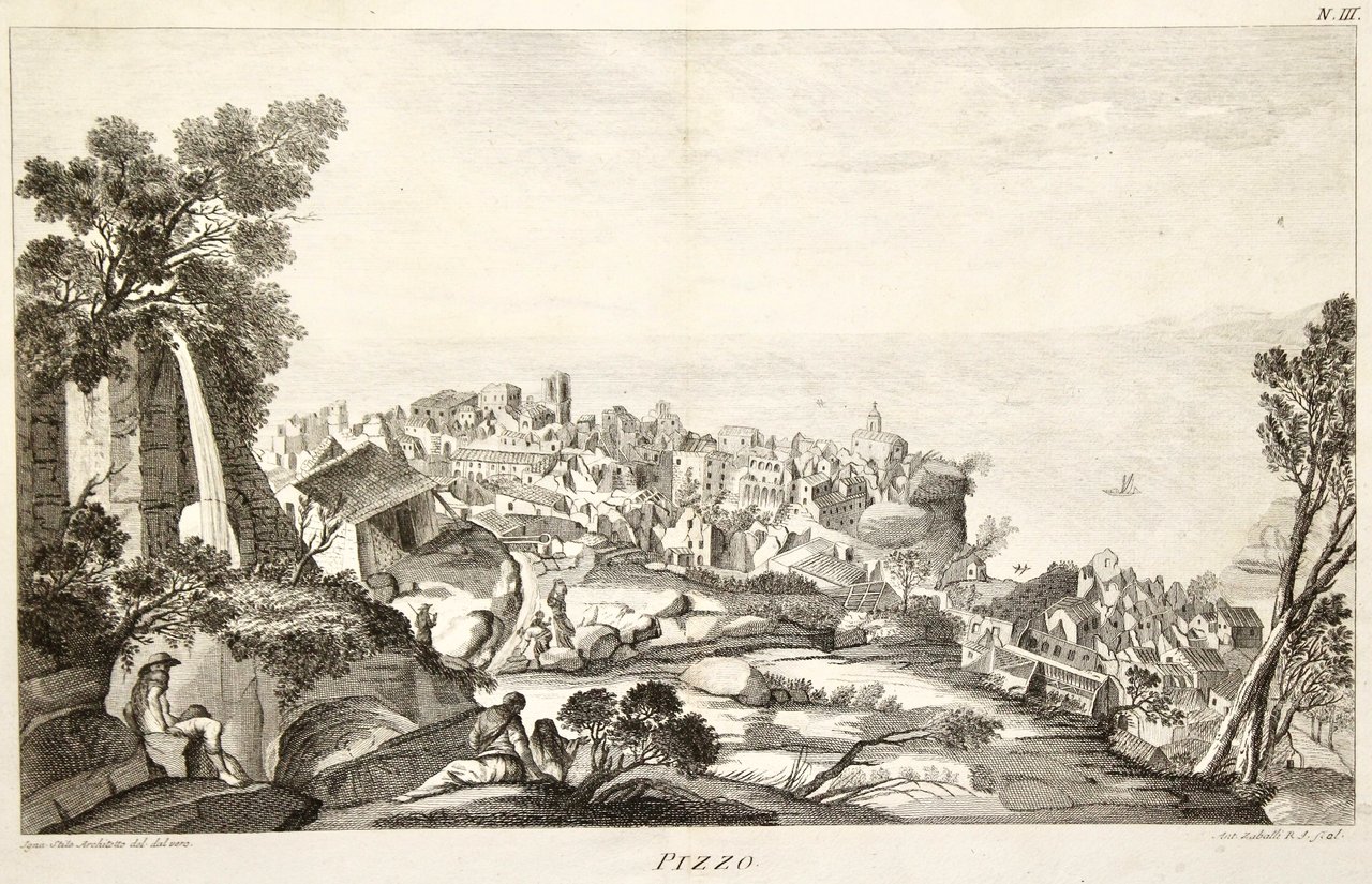 Incisione in rame, mm 225x378, eseguita su carta vergellata con filigrana da Antonio Zaballi su disegno di Ignazio Stile. Tratta dall'Atlante allegato a "Istoria de fenomeni del tremoto avvenuto nelle Calabrie, e nel Valdemone nell'anno 1783". Le incisioni di quest'opera illustrano le macerie del terremoto calabrese del 1783 e furono commissionate dal napoletano dalla Reale Accademia di Napoli ad un gruppo di scienziati, incluso lo stesso Sarconi. Si trattò della prima spedizione scientifica organizzata in Italia sulle conseguenze di un terremoto. Qualche alone marginale. Ottimo esemplare. <BR>