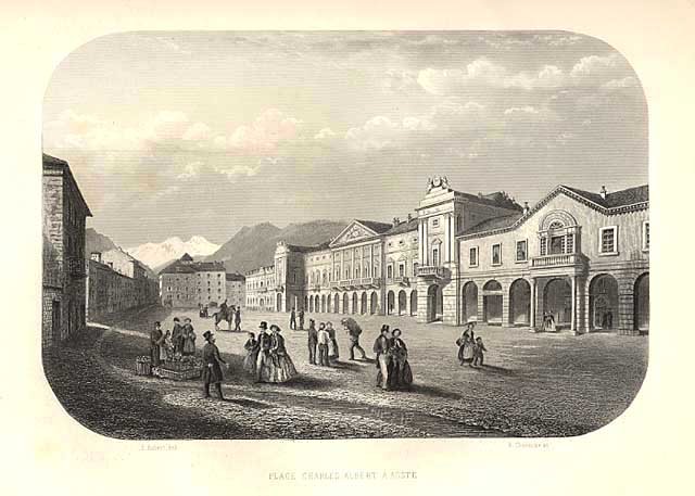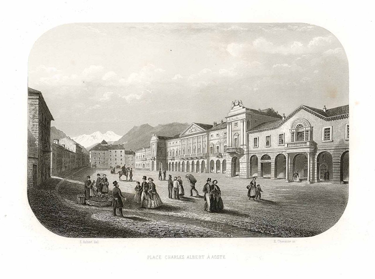 Stampa, antica ed originale, con veduta del centro della città. Tratta dall'opera "La Vallée d'Aoste de Edouard Aubert" edita a Parigi da Amyot. Autore: Aubert E. del. - E. Chavanne sc. Luogo: Valle d'Aosta - Aosta. Anno: 1860. Tecnica: incisione in acciaio. Dimensioni: 144x215 mm