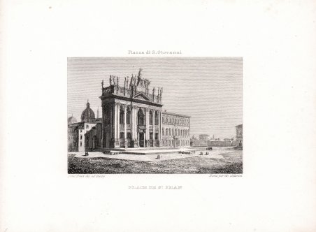 Veduta tratta dall’edizione curata da Giovanni Gallarini nel 1841 della celebre guida di Erasmo Pistolesi, la ' Descrizione di Roma e suoi contorni: con nuovo e breve metodo per vedere la città in 8 giorni; adorna d'incisioni de'primi bulini. Questa edizione della guida è adornata da numerose tavole sui principali siti e monumenti della città, finemente intagliate da Domenico Amici e Gaetano Cottafavi. Le vedute sono molto simili a quelle che i due incisori avevano realizzato nel 1838 per l’editore Agostino Valentini per illustrare la ' guida di Antoine Nibby, ' Itinéraire de Rome et de ses environs rédigé par A.N. d'après celui de M. Vasi. Nouvelle édition.enrichie de savantes observations. Rome, Proprieté d'Aug. Valentini, 1838/41. Differiscono, oltre per piccoli particolari quali i personaggi e il campo visivo, per il titolo in francese posto in basso e quello in italiano – più piccolo – in alto; esattamente il contrario di quelle incise per il Valentini. Le tavole vengono ristampate dall’editore Gallarini senza il testo ' nell’Album delle più interessanti vedute di Roma nuovamente disegnate dal vero ed incise con tutta finitezza da Domenico Amici e Gaetano Cottafavi, stampato in Roma, presso l’editore proprietario Giovanni Gallarini Librajo, Negoziante di Musica, Stampe, Carte Geografiche ed oggetti di cartoleria Ingl.e e Franc.e, Piazza di Monte Citorio n. 19, 20, 21 e 23. Acquaforte e bulino, con ampi margini, in buono stato di conservazione. View taken from the edition edited by Giovanni Gallarini in 1841 of Erasmo Pistolesi's famous guidebook, the ' Descrizione di Roma e suoi contorni: con nuovo e breve metodo per vedere la città in 8 giorni; adorna d'incisioni de'primi bulini. This edition of the guide is adorned with numerous plates on the main sites and monuments of the city, finely engraved by Domenico Amici and Gaetano Cottafavi. The views are very similar to those the two engravers had produced in 1838 for publisher Agostino Valentini to illustrate Antoine Nibby's guidebook, ' Itinéraire de Rome et de ses environs rédigé par A.N. d'après celui de M. Vasi. Nouvelle édition.enrichie de savantes observations. Rome, Proprieté d'Aug. Valentini, 1838/41. They differ, besides small details such as characters and field of view, in the title in French placed at the bottom and the title in Italian - smaller - at the top; exactly the opposite of those engraved for Valentini. The plates are reprinted by publisher Gallarini without the text in the ' Album delle più interessanti vedute di Roma nuovamente disegnate dal vero ed incise con tutta finitezza da Domenico Amici e Gaetano Cottafavi, stampato in Roma, presso l’editore proprietario Giovanni Gallarini Librajo, Negoziante di Musica, Stampe, Carte Geografiche ed oggetti di cartoleria Ingl.e e Franc.e, Piazza di Monte Citorio n. 19, 20, 21 e 23. Etching and engraving, with wide margins, in good condition. Cfr.