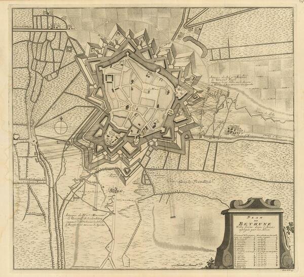 Plan de Bethune. Ville forte dans l'Artois assiegée par les Alliez