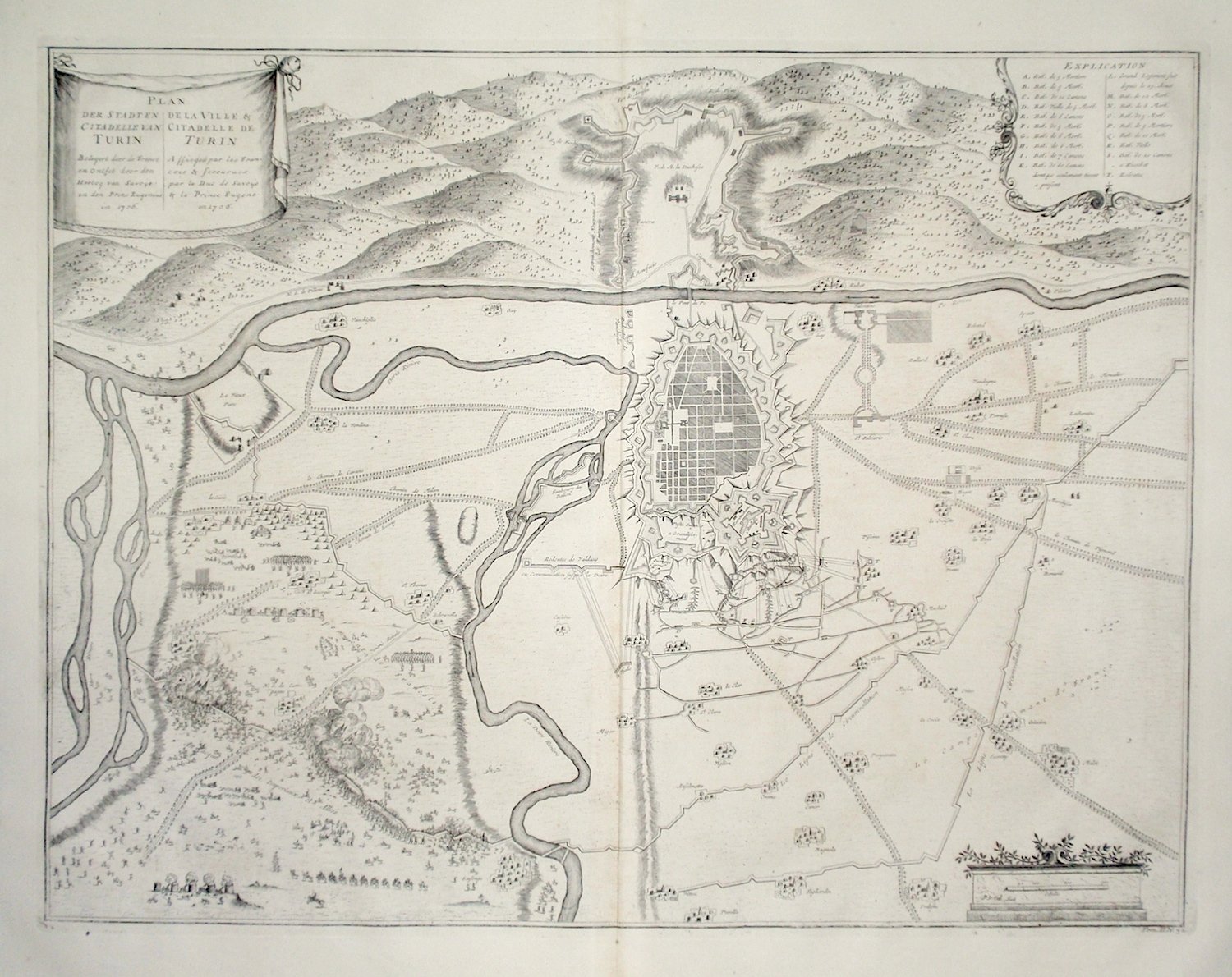 Incisione in rame, mm 455x595. Tratta da "Batailles gagnees par le Prince Eugene de Savoie". Ottimo esemplare.