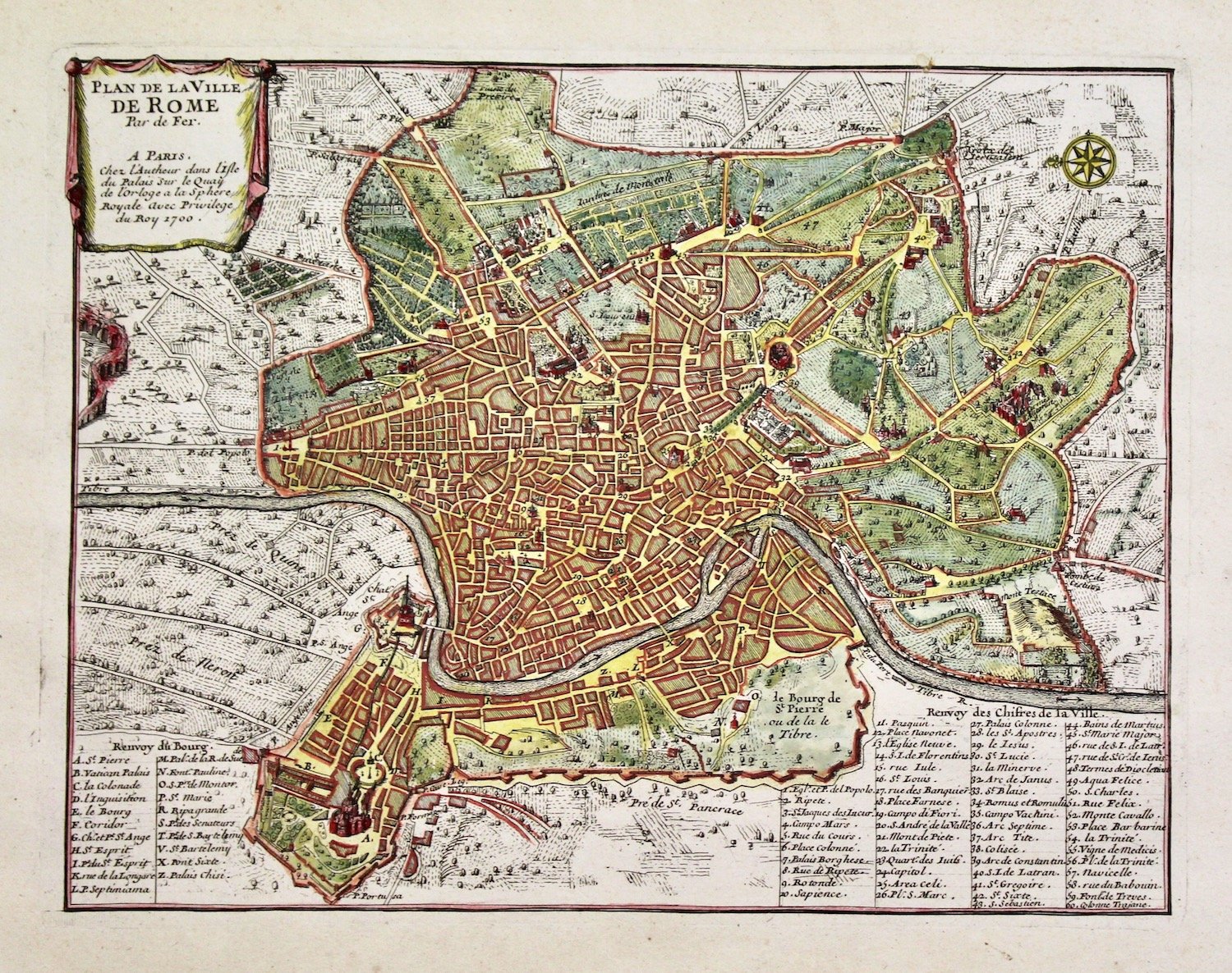 Incisione in rame, coloritura d'epoca con ritocchi recenti, mm 235x310. Decorativa pianta della città con cartigio in alto a sinistrra e legenda in basso. Bell'esemplare sulla tipica carta forte settecentesca.