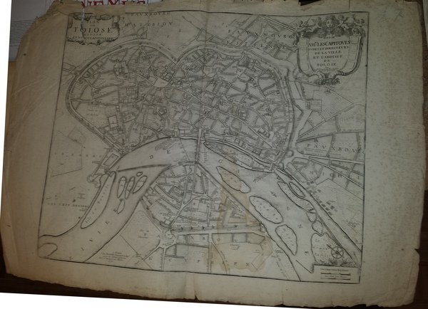 Incisione su rame, carta vergata forte; foglio 570 x 780 mm, (522x 608 mm alla battuta). Mappa di Tolosa molto rara.considerato il primo mappe moderne della città. E 'dedicata a Capitouls (consiglio comunale eletto) giudici e amministratori della città, così come Toulouse gardiage (territorio adiacente alla città). La dedica del cartiglio è decorato con la stemma reale.