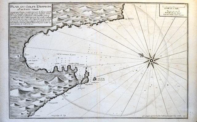 Francia, 1732 - 1746 circa. Tratta dal “Recueil de plusieurs plans des ports et rades et de quelques cartes particulières de la mer Mediterranee" par Jacques Ayrouard pilote Real avec privilege du Roy. Incisione in rame all'acquaforte, b/n, cm 30 x 46 circa (alla lastra) più margini. Disegnata dal Ayrouard e incisa dal Corne (in lastra in bs. a ds. “par Jacques Ayrouard pilote real et gravé par Louis Corne”), piano del Golfo di La Spezia e Porto Venere, è segnalata anche Santa Margherita Ligure; si segnalano scandagli, pericoli per la navigazione e ancoraggi che si trovano lungo la costa. Poco si sa su Jacques Ayrouard, il quale pubblicò solo questo libro sui porti del Mediterraneo. Era un navigatore per la Marina Reale francese e dedicò il suo lavoro a Jean Federico Phélypeaux Comte de Maurepas, che fu Ministro della Marina per Luigi XV. Modeste presenze di umido, buona carta e impressione, buona conservazione.