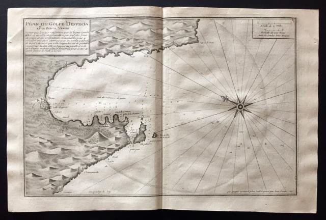 Francia, 1732 - 1746 circa. Tratta dal “Recueil de plusieurs plans des ports et rades et de quelques cartes particulières de la mer Mediterranee" par Jacques Ayrouard pilote Real avec privilege du Roy. Incisione in rame all'acquaforte, b/n, cm 30 x 46 circa (alla lastra) più margini. Disegnata dal Ayrouard e incisa dal Corne (in lastra in bs. a ds. “par Jacques Ayrouard pilote real et gravé par Louis Corne”), piano del Golfo di La Spezia e Porto Venere, è segnalata anche Santa Margherita Ligure; si segnalano scandagli, pericoli per la navigazione e ancoraggi che si trovano lungo la costa. Poco si sa su Jacques Ayrouard, il quale pubblicò solo questo libro sui porti del Mediterraneo. Era un navigatore per la Marina Reale francese e dedicò il suo lavoro a Jean Federico Phélypeaux Comte de Maurepas, che fu Ministro della Marina per Luigi XV. Leggero sfondo di inchiostratura, molto buono lo stato di conservazione.