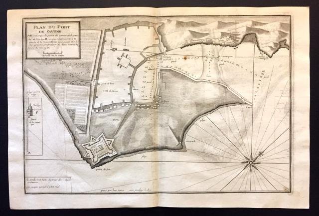 Francia, 1732 - 1746 circa. Tratta dal “Recueil de plusieurs plans des ports et rades et de quelques cartes particulières de la mer Mediterranee" par Jacques Ayrouard pilote Real avec privilege du Roy. Incisione in rame all'acquaforte, b/n, cm 31 x 46,5 circa (alla lastra) più margini. Disegnata dal Ayrouard e incisa dal Corne, piano del Porto di Savona; si segnalano scandagli, pericoli per la navigazione e ancoraggi che si trovano lungo la costa. Poco si sa su Jacques Ayrouard, il quale pubblicò solo questo libro sui porti del Mediterraneo. Era un navigatore per la Marina Reale francese e dedicò il suo lavoro a Jean Federico Phélypeaux Comte de Maurepas, che fu Ministro della Marina per Luigi XV. Un punto di ossidazione in alto, leggermente spostato sulla sinistra, leggero sfondo di inchiostratura, peraltro foglio in ottimo stato di conservazione.