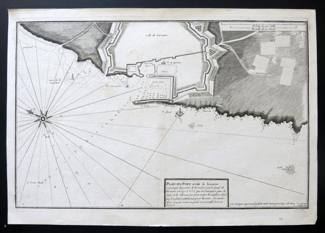 rancia, 1732 - 1746 circa. Tratta dal “Recueil de plusieurs plans des ports et rades et de quelques cartes particulières de la mer Mediterranee" par Jacques Ayrouard pilote Real avec privilege du Roy. Incisione in rame all'acquaforte, b/n, cm 30 x 46 circa (alla lastra) più margini. Disegnata dal Ayrouard e incisa dal Corne (in lastra in bs. a ds. “par Jacques Ayrouard pilote real avec privilege du Roy L. Corne Sculp. 24), piano del porto e rada di Livorno; si segnalano scandagli, pericoli per la navigazione e ancoraggi che si trovano lungo la costa. Poco si sa su Jacques Ayrouard, il quale pubblicò solo questo libro sui porti del Mediterraneo. Era un navigatore per la Marina Reale francese e dedicò il suo lavoro a Jean Federico Phélypeaux Comte de Maurepas, che fu Ministro della Marina per Luigi XV. Alcuni leggeri punti di invecchiamento della carta, buona impressione e buona conservazione.