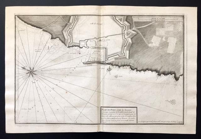 rancia, 1732 - 1746 circa. Tratta dal “Recueil de plusieurs plans des ports et rades et de quelques cartes particulières de la mer Mediterranee" par Jacques Ayrouard pilote Real avec privilege du Roy. Incisione in rame all'acquaforte, b/n, cm 30 x 45,5 circa (alla lastra) più margini. Disegnata dal Ayrouard e incisa dal Corne (in lastra in bs. a ds. “par Jacques Ayrouard pilote real avec privilege du Roy L. Corne Sculp. 24), piano del porto e rada di Livorno; si segnalano scandagli, pericoli per la navigazione e ancoraggi che si trovano lungo la costa. Poco si sa su Jacques Ayrouard, il quale pubblicò solo questo libro sui porti del Mediterraneo. Era un navigatore per la Marina Reale francese e dedicò il suo lavoro a Jean Federico Phélypeaux Comte de Maurepas, che fu Ministro della Marina per Luigi XV. leggero sfondo di inchiostratura, molto ben impressa, ottimo stato di conservazione.