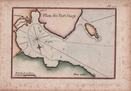 Piano nautico tratto dal " Recueil des principaux plans des ports & rades de la Méditerranée" di Josepgh Roux, pubblicato per la prima volta a Marsiglia nel 1764 e successivamente ristampato - ampliato - a Genova da Yves Gravier con il titolo "Recueil de 163 principaux plans des ports et rades de la Mediterranée" (1804).Ulteriore edizione dell'opera, con il titolo "Plans des ports ed des rades de la Mer Méditerranée." è stampata a Livorno da Carlo Tesi nel 1858.Incisione in rame, finemente acquarellata a mano, in ottimo stato di conservazione. First published in the "Recueil des principaux plans des ports et rades de la Mer Mediterranee", 1764, this nice nautical chart is taken from the rare "Plans des ports ed des rades de la Mer Méditerranée." published in Leghorn by Carlo Tesi, 1858.Copperplate with fine colouring, in very good condition. Cfr.