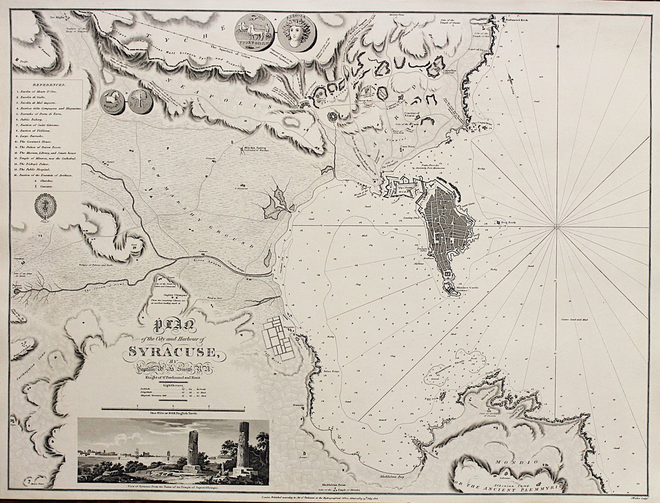Incisione in rame di J. Walker, mm 460x613; tratta dall'opera "The Hydrography of Sicily, Malta, and Adjacent Islands: Survey in 1814, 1815, and 1816". L'ammiraglio Smyth fu uno dei principali cartografi marittimi di inizio Ottocento. Esemplare in perfette condizioni<BR>Copper engraving by J Walker, mm 460x613, from "The Hydrography of Sicily, Malta, and Adjacent Islands: Survey in 1814, 1815, and 1816".<BR>An Admiral and scientific writer, William Henry Smyth was one of the most influential of Admiralty surveyors of the period. From 1813 he served as Lieutenant with the Sicilian flotilla against the French in Naples, combining naval duties with his own surveying and antiquarian research. In September 1815 he was made Commander and continued carrying out his surveys along the coasts of Sicily, Italy and the opposite shores of Africa. From 1817 his role as surveyor became official and he produced a great number of important sea charts. A Fellow of the Society of Antiquaries and the Royal Astronomical Society, Smyth later went on to become one of the founders of the Royal Geographical Society. Perfect condition<BR>