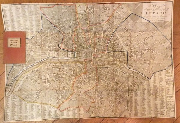 Bella pianta di Parigi (cm. 55,5 x 81), incisa in rame su carta pesante, più volte ripiegata, con le zone delineate da contorni a penna blu, rossa, verde e gialla; titolo inciso sul lato dx in alto ed elenco alfabetico delle vie disposto sugli altri 3 lati. La pianta è conservata in una custodia (cm. 15,7 x 10,5) in cartone rosso con titolo Nouveau Plan de Paris su etichetta. Picc. buchino a una delle pieghe della carta, peraltro ben conservata; la custodia presenta delle lievi manc.