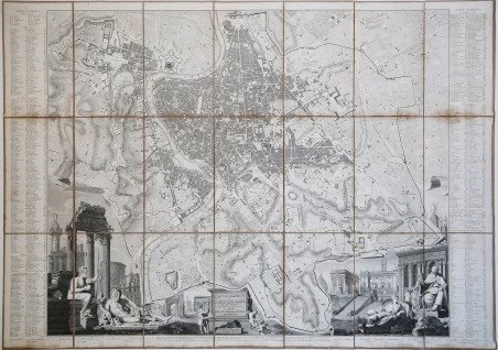 Pianta a proiezione verticale, orografica, orientata con il nord in alto.Si tratta, di una derivazione ridotta ed aggiornata della pianta di Giovan Battista Nolli del 1748, pubblicata per la prima volta nel 1838 - priva dell'apparato decorativo in basso, derivante interamente dal Nolli, che appare solamente in questa ristampa del 1841, emendata sulla vecchia lastra. Sono aggiunti orografia e rappresentazione delle aree verdi. "In basso, sotto la pianta, sono state inoltre aggiunte a sinistra una vista del Colosseo e la colonna Traiana con le tre colonne del Foror Romano in primo piano e a destra il Campidoglio. I rioni sono contraddistinti in pianta da numeri romani. In basso a destra troviamo le firme dei vari incisori. Ai due lati legende divise per argomenti. Non è stato possibile verificarlo, ma è probabile che questa pianta venisse venduta avulsa dall'opera" (cfr. Marigliani p. 285).Acquaforte, stampata su carta coeva, tagliata ed applicata su tela e montata ad astuccio, piccole ossidazioni, per il resto in buono stato di conservazione. Vertical projection map, orographic, oriented with the north at the top.It is a reduced and updated derivation of Giovan Battista Nolli's map of 1748, published for the first time in 1838 - without the decorative apparatus at the bottom, deriving entirely from Nolli, which appears only in this reprint of 1841, amended on the old plate. Orography and representation of the green areas are added. At the bottom, under the map, a view of the Colosseum and the Trajan's column with the three columns of the Foror Romano in the foreground and the Capitol on the right have been added. The districts (rioni) are marked in the map by Roman numbers. At the bottom right we find the signatures of the various engravers. On the two sides legends divided by topics. Etching, printed on contemporary paper, cut and applied on canvas and mounted in a case, light foxing, for the rest in good condition. Cfr. C. Marigliani, "Le Piante di Roma delle collezioni private", n. 285; Scaccia Scarafoni, "Le Piante di Roma", n. 290.