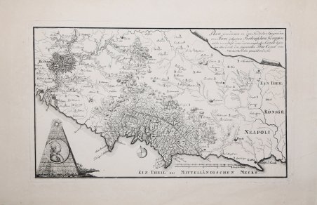 Importante e rarissimo documento sulle Paludi Pontine, di manifattura tedesca, stampato probabilmente a Lipsia alla fine del XVIII secolo. Non descritto dalla bibliografia. In basso a sinistra troviamo il ritratto di papa Pio VI, che sostenne economicamente il progetto di bonifica. La mappa colloca e Paludi Pontine in un contesto più ampio del Lazio meridionale, inclusa la Ciociaria e fin oltre il confine con il Regno di Napoli. Sotto il nome di “Paludi Pontine” e con quello odierno di Agro Pontino si intende il territorio compreso fra i Monti Lepini e gli Ausoni, il Mar Tirreno e il promontorio del Circeo. Un territorio che si estende fin verso Roma, senza un confine fisico ben definito che distingua l’Agro Pontino dall’Agro Romano, anche per le caratteristiche geologiche e fisiche del suolo; comunque come limite, puramente convenzionale, tra l’Agro Romano e l’Agro Pontino si può considerare il corso inferiore e medio del Fiume Astura e una linea immaginaria che, partendo dai piedi della collina su cui sorge Cori, all’altezza di circa 120 m sul livello del mare, e mantenendosi su questa quota, si spinge fino ai piedi dell’altura su cui è posta Lanuvio. Si può affermare che, stando a quanto pervenuto sino a noi, la conoscenza della regione pontina era molto imprecisa allorché Sisto V pose mano ai grandi lavori idraulici diretti da Ascanio Fenizi (1585÷1590). Nel corso del XVIII secolo, la bonifica delle paludi interessa i più importanti architetti e idraulici dell'epoca: olandesi come Cornelio Wit ed altri, italiani come appunto l'architetto Angelo Sani e, da ultimo, Gaetano Rappini che, sotto l'impulso di papa Pio VI, con i lavori avviati nel 1777 apre il canale lungo l'Appia o Linea Pia. Due carte rendono con efficacia lo stato della palude prima della bonifica di Pio VI, quella del Ghisi del 1778 e quella del Salvati del 1795; successivamente a queste, soltanto una pregiata cartografia incisa in rame dell'Astolfi e quelle effettuate dai consorzi di bonifica, andate distrutte durante il secondo conflitto bellico, risultarono di grande utilità per il compimento della bonifica integrale. Acquaforte, impressa su carta vergata coeva, con margini, in ottimo stato di conservazione. Mappa molto rara. Importante e rarissimo documento sulle Paludi Pontine, di manifattura tedesca, stampato probabilmente a Lipsia alla fine del XVIII secolo. Non descritto dalla bibliografia. In basso a sinistra troviamo il ritratto di papa Pio VI, che sostenne economicamente il progetto di bonifica. La mappa colloca e Paludi Pontine in un contesto più ampio del Lazio meridionale, inclusa la Ciociaria e fin oltre il confine con il Regno di Napoli. Sotto il nome di “Paludi Pontine” e con quello odierno di Agro Pontino si intende il territorio compreso fra i Monti Lepini e gli Ausoni, il Mar Tirreno e il promontorio del Circeo. Un territorio che si estende fin verso Roma, senza un confine fisico ben definito che distingua l’Agro Pontino dall’Agro Romano, anche per le caratteristiche geologiche e fisiche del suolo; comunque come limite, puramente convenzionale, tra l’Agro Romano e l’Agro Pontino si può considerare il corso inferiore e medio del Fiume Astura e una linea immaginaria che, partendo dai piedi della collina su cui sorge Cori, all’altezza di circa 120 m sul livello del mare, e mantenendosi su questa quota, si spinge fino ai piedi dell’altura su cui è posta Lanuvio. Si può affermare che, stando a quanto pervenuto sino a noi, la conoscenza della regione pontina era molto imprecisa allorché Sisto V pose mano ai grandi lavori idraulici diretti da Ascanio Fenizi (1585÷1590). Nel corso del XVIII secolo, la bonifica delle paludi interessa i più importanti architetti e idraulici dell'epoca: olandesi come Cornelio Wit ed altri, italiani come appunto l'architetto Angelo Sani e, da ultimo, Gaetano Rappini che, sotto l'impulso di papa Pio VI, con i lavori avviati nel 1777 apre il canale lungo l'Appia o Linea Pia. Due carte rendono con efficacia lo stato della palude prima della bonifica di Pio VI, quella del Ghisi del 1778 e quella del Salvati del 1795; successivamente a queste, soltanto una pregiata cartografia incisa in rame dell'Astolfi e quelle effettuate dai consorzi di bonifica, andate distrutte durante il secondo conflitto bellico, risultarono di grande utilità per il compimento della bonifica integrale. Acquaforte, impressa su carta vergata coeva, con margini, in ottimo stato di conservazione. Mappa molto rara. Cfr.