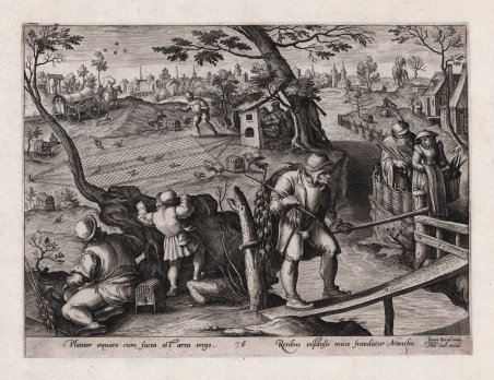 Caccia al fringuello; in primo piano a destra, un cacciatore, con una coppia di fringuelli e un bastone, attraversa una passerella su un ruscello. Firmata e titolata sotto l'immagine: Planior aequato cum facta est area tergo, / Retibus expansis mitis fraudatur Acanthis. / Ioann. Strad. inven. / Phls Gall. excud.' Bulino, circa 1578. Esemplare di primo stato, avanti il numero. Della serie ' Venationes Ferarum, Avium, Piscium, da disegni di Jan van der Straet detto Stradano o Stradanus (Bruges 1523 - Firenze 1605), pubblicata ad Anversa da Philip Galle. Di ritorno ad Anversa dal suo lungo viaggio in Italia, lo Stradano conobbe Philip Galle, già allievo di Hieronimus Cock e da poco dedito all’arte dell’editoria. I due progettarono la produzione di una serie di soggetti venatori, ispirati agli arazzi della villa di Poggio a Caiano. Il Galle all’inizio diede alla luce una serie di incisioni senza numerazione, alla quale fece seguita una seconda stesura composta da frontespizio e 44 tavole numerate. La fortuna immediata dell’opera convinse l’editore a proseguire la collaborazione con lo Stradano che venne così impegnato nell’esecuzione di nuovi disegni, con temi venatori esotici ed inusuali. Questo nuovo ciclo fu dapprima pubblicato separatamente, ed in seguito unito al precedente, costituendo la vasta serie di 104 tavole, intitolata appunto ' Venationes Ferarum, Avium, Piscium, Pugnae. ' La serie è databile tra il 1578 (data sul frontespizio) e il 1596. Come già gli arazzi della villa di Poggio a Caiano, l’opera è raggruppata per argomenti suddivisi in tre vaste categorie: animali terrestri, d’aria e d’acqua. All’inizio le scene di caccia furono incise dallo stesso Philip Galle che successivamente impiegò altri membri della sua famiglia ed assistenti vari quali Adriaen e Jan Collaert, Theodor e Cornelis Galle e Carolus de Mallery. Magnifica prova, impressa su carta vergata coeva, rifilata al rame, in buono stato di conservazione. Applicata agli angoli posteriori su antico supporto cartaceo. Bibliografia New Hollstein (Dutch & Flemish) / The New Hollstein: Dutch and Flemish etchings, engravings and woodcuts 1450-1700 (456.I); Baroni Vannucci 1997 / Jan van der Straet, detto Giovanni Stradano, flandrus pictor et inventor (693.79). Finch Hunt; in the right foreground, a huntsman, bearing a brace of finches and a stick crosses a footbridge over a stream; a couple stand on the other side of the stream, to the right; in the left foreground, a man and a boy, concealed behind a tree and seen from behind, watch the hunt in the mid ground beyond, in which two figures, centre, crouching behind a ' shelter, catch finches using nets and a rope; beyond, to the left, a wagon carries people towards a town on the horizon. Lettered below image: Planior aequato cum facta est area tergo, / Retibus expansis mitis fraudatur Acanthis. / Ioann. Strad. inven. / Phls Gall. excud.' Engraving, circa 1578. Example of the rare first state, before the number. From the "Venationes Ferarum, Avium, Piscium", after Jan van der Straet called Stradano or Stradanus, published by Philip Galle. Once back in Antwerp, after a long trip to Italy, Stradano met Philip Galle, former pupil of Hieronumus Cock, who had recentely devouted himself to the art of printing. They planned together the realization of hunting subjects, inspired by the tapestry of the Villa in Poggio a Caiano. At the beginning, Galle realized a series of engravings without numbers, to which a second edition followed, with title page and 44 numbered plates. The sudden fame of his work convinced the printer to go on with his cooperation with Stradano, who realized new drawings with uncommon and exotic hunting subjects. The new series was published first separately, then together with the first edition, forming a wide series of 104 plates, named Venationes Ferarum, Avium, Piscium, Pugnae. This work can be dated between 1578 (on the front page) and 1596. As for the tapestry of the Villa in Poggio a Caiano, the work is divided in three wide categories: terrestrial, air and water animals. At the beginning the hunting scenes have been engraved by Philip Galle himself, who then hired other members of his family and other assistants, among which Adriaen and Jan Collaert, Theodor and Cornelis Galle and Carolus de Mallery. Magnificent work, printed on contemporary laid paper, trimmed to the platemark, in good condition. Laid down, on the four corners, on antique mounting. Bibliografia New Hollstein (Dutch & Flemish) / The New Hollstein: Dutch and Flemish etchings, engravings and woodcuts 1450-1700 (456.I); Baroni Vannucci 1997 / Jan van der Straet, detto Giovanni Stradano, flandrus pictor et inventor (693.79). Cfr.