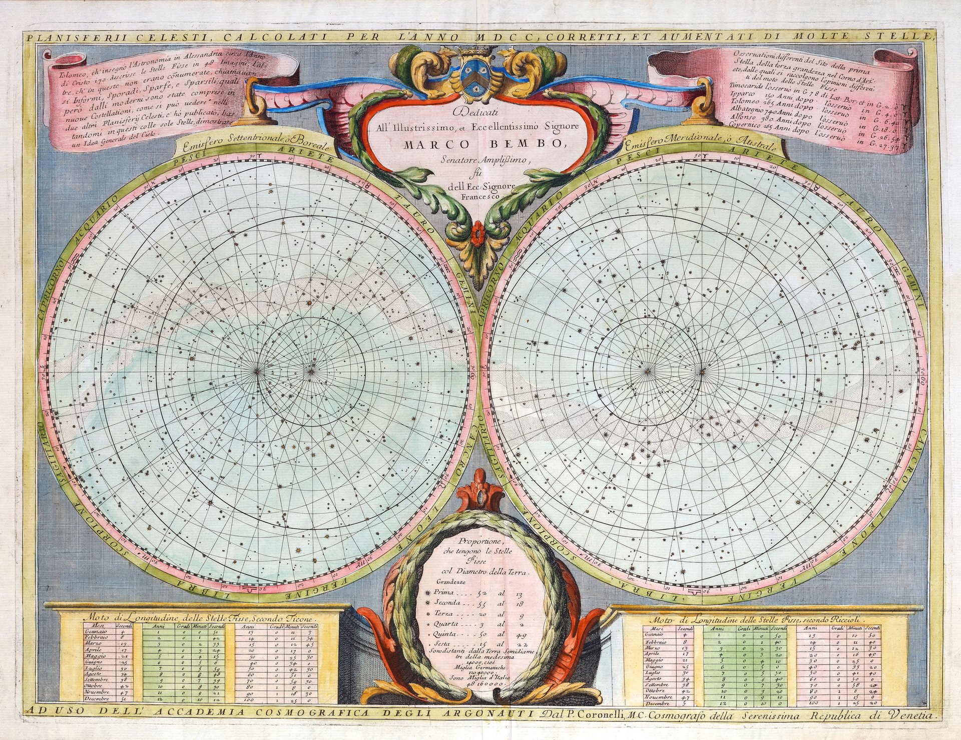 Incisione in rame, dipinta a mano, mm 465x610. Interessante tavola astronomia raffigurante i due emisferi con tutte le stelle e costellazioni. In basso riporta in due riquadri il moto delle stelle fisse secondo Tycho Brahe e Riccioli. Dedica a Marco Bembo, al centro una legenda dei rapporti di grandezza fra terra e stelle. Tratta da "Corso geografico" (1688-92) una delle più celebri opere del vulcanico religioso veneziano, autore fra la fine del secolo e gli inizi del successivo di decine di importanti pubblicazioni fra cui ricordiamo il "Libro dei globi", oltre ai celebri globi costruiti per il re di Francia, "Teatro della guerra", "Atlante veneto" e "Teatro delle città". Ottimo stato di conservazione. <BR>